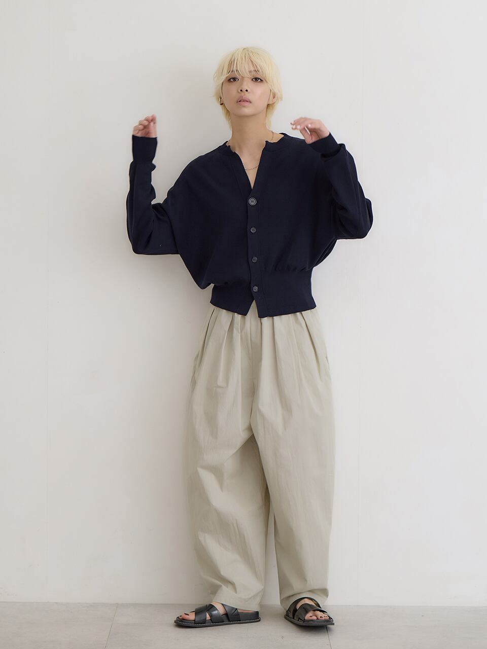 リラックスパンツと合わせてもカジュアルになりすぎません。