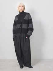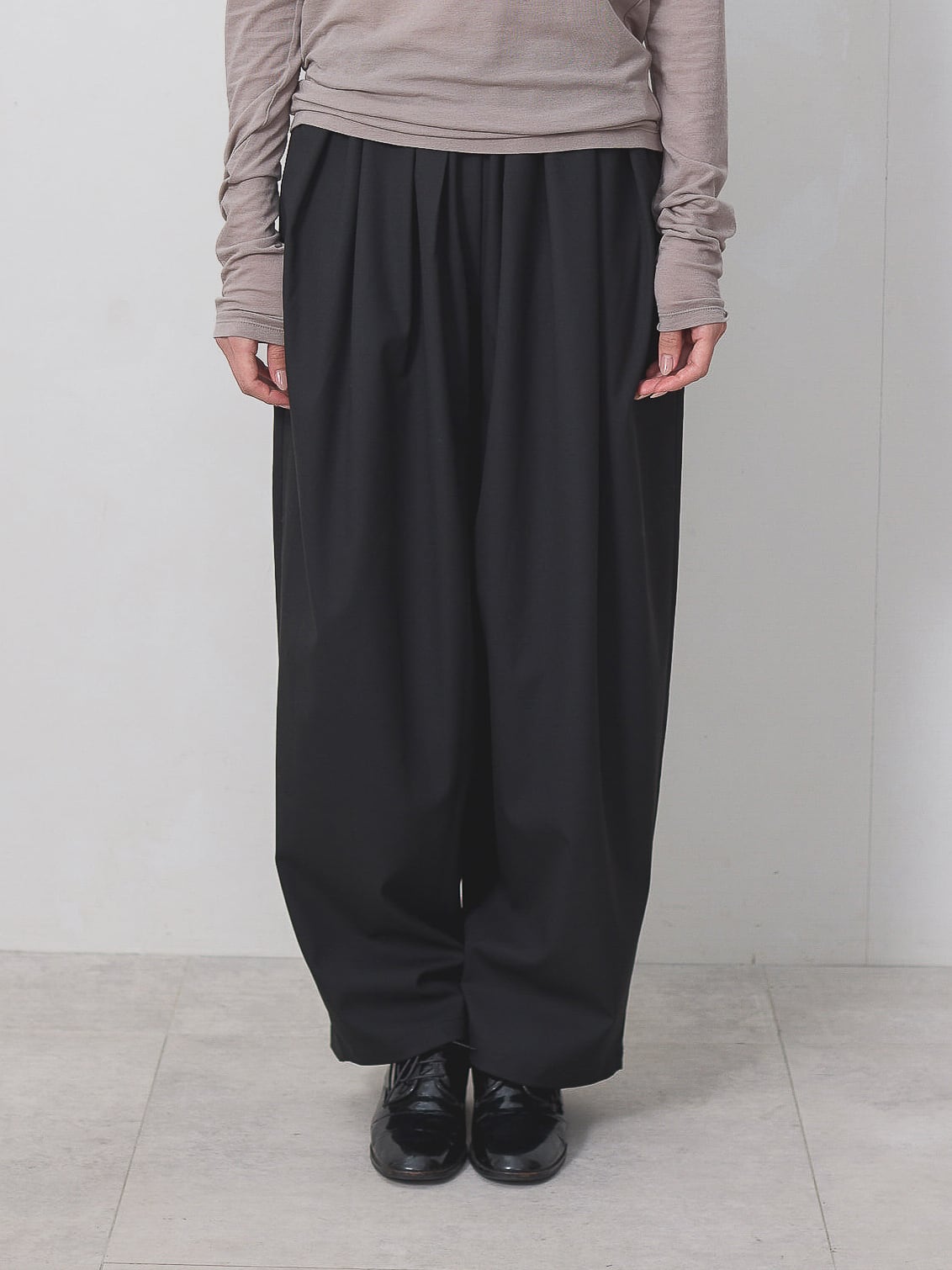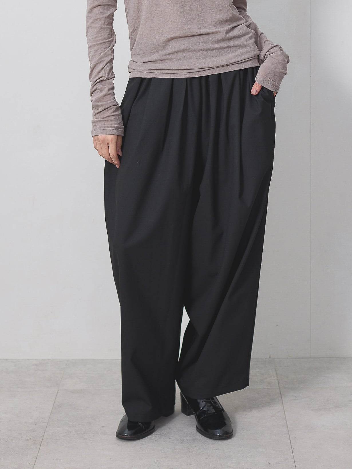 梳毛調の素材を使用した、タックとギャザーをたっぷり取ったワイドカーブパンツ。