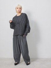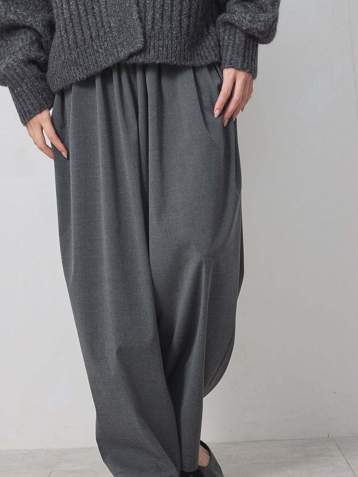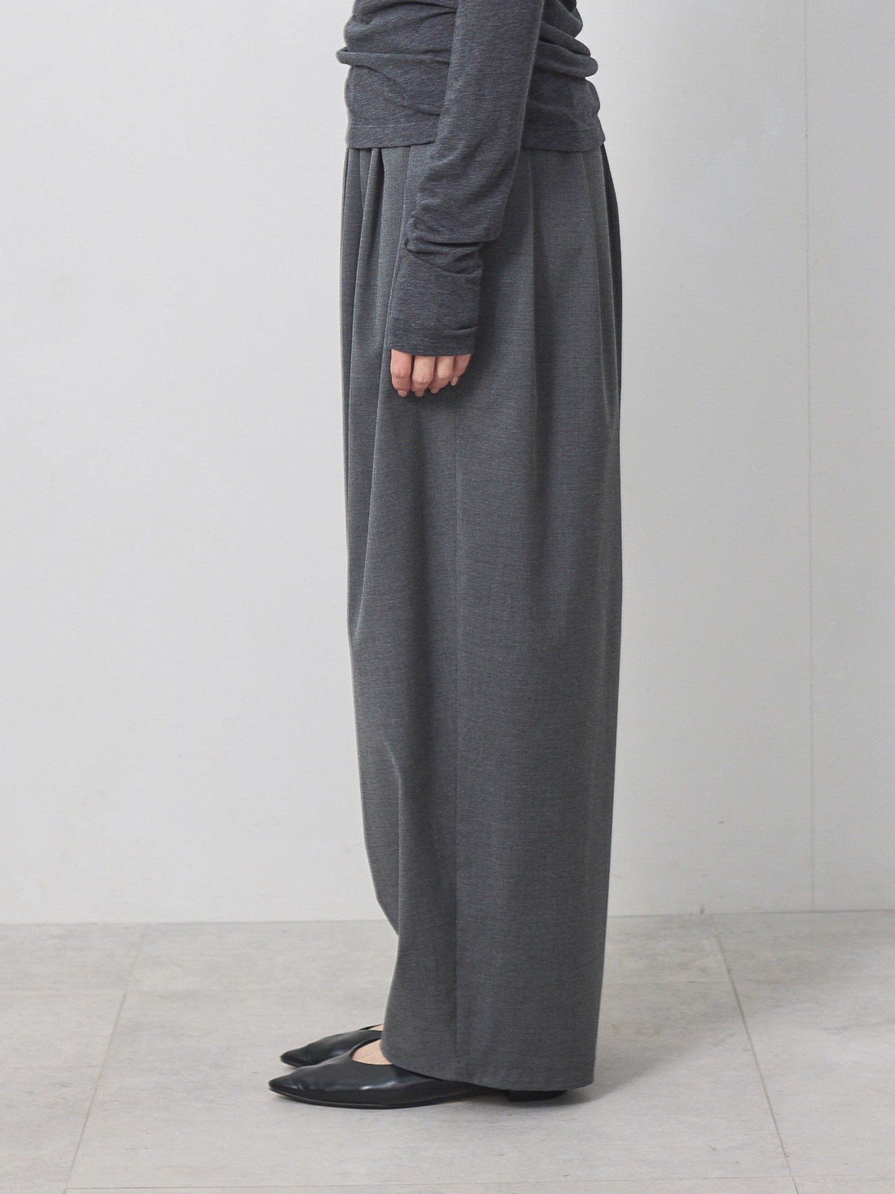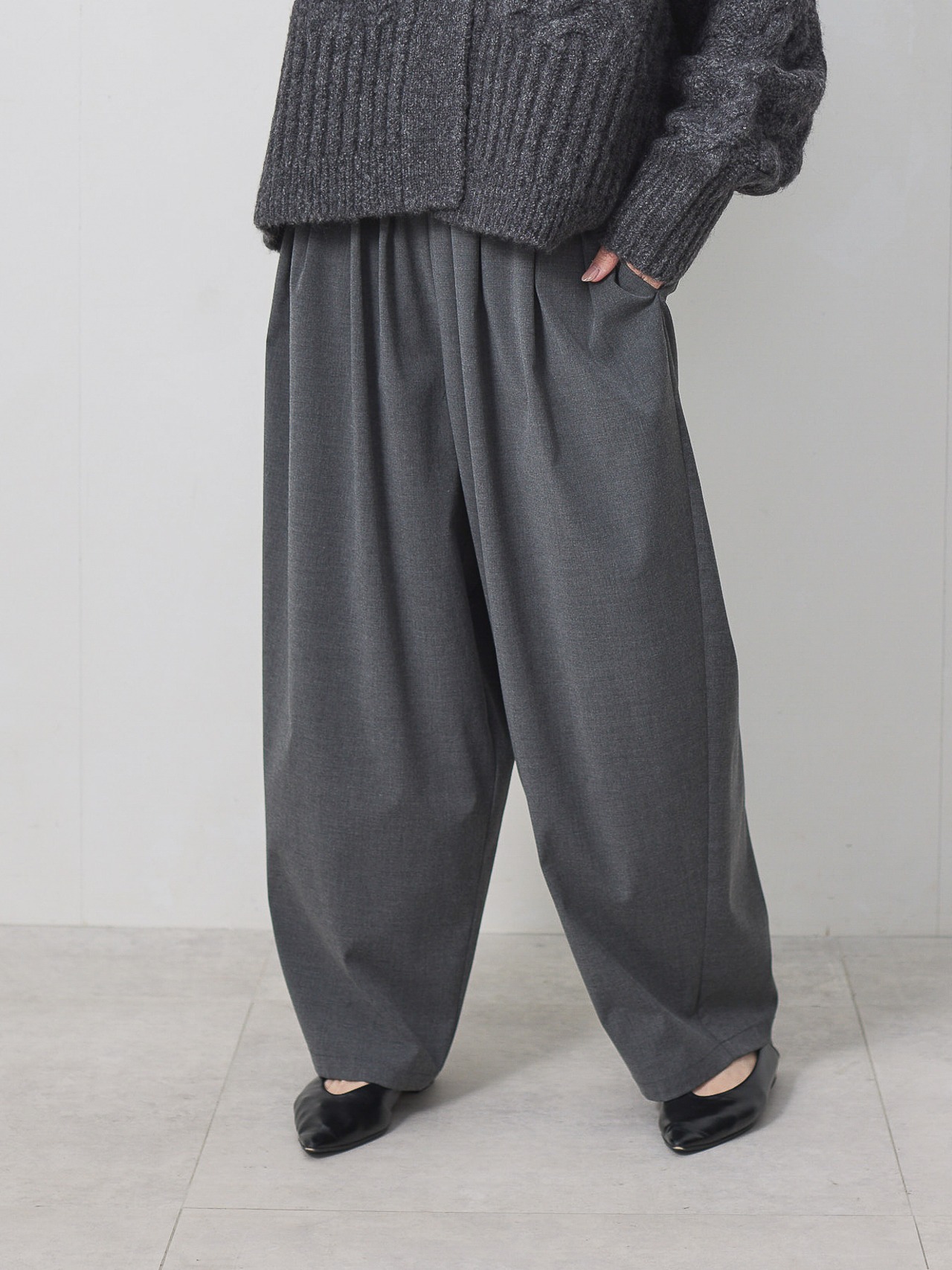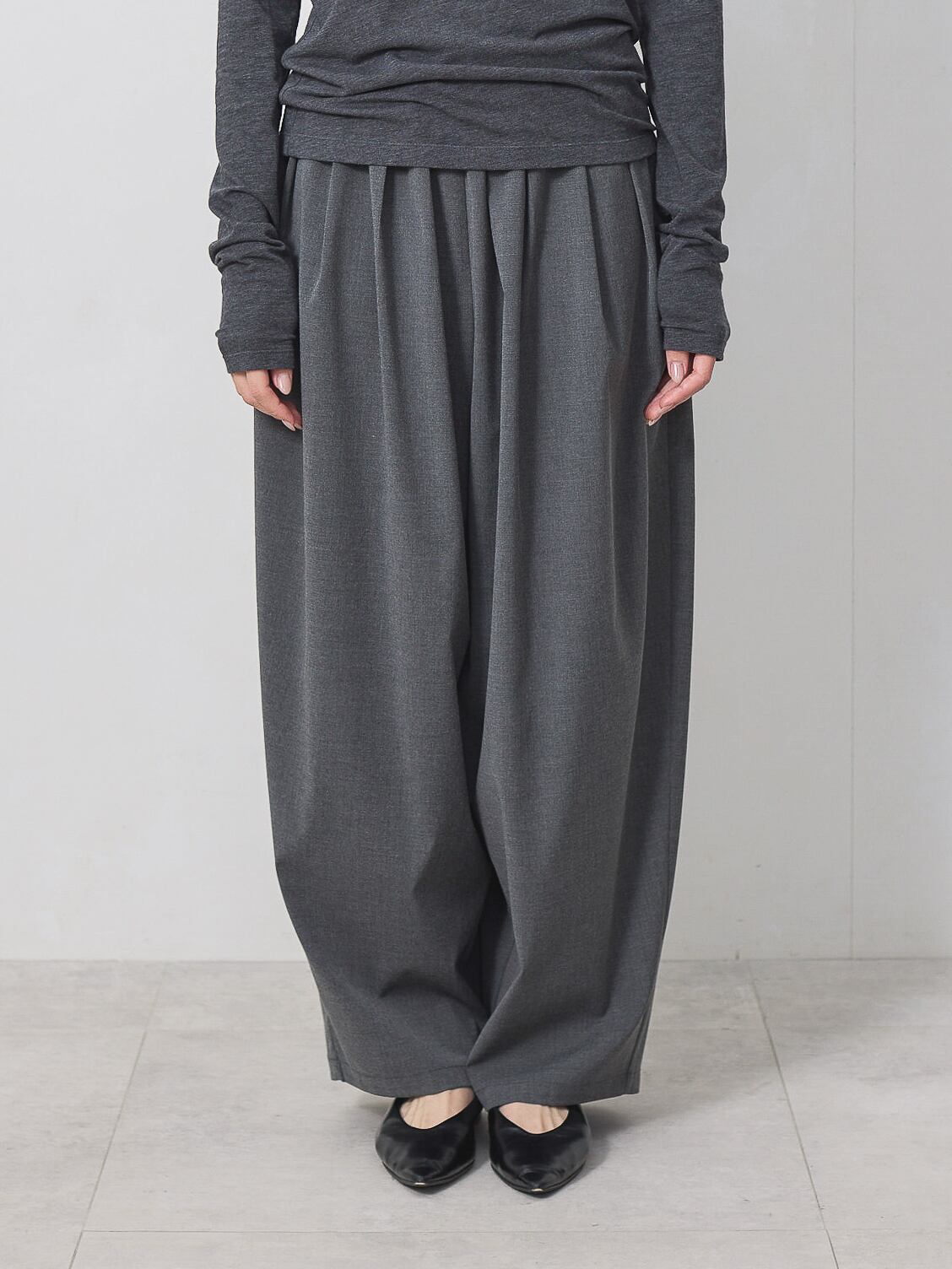 梳毛調の素材を使用した、タックとギャザーをたっぷり取ったワイドカーブパンツ。