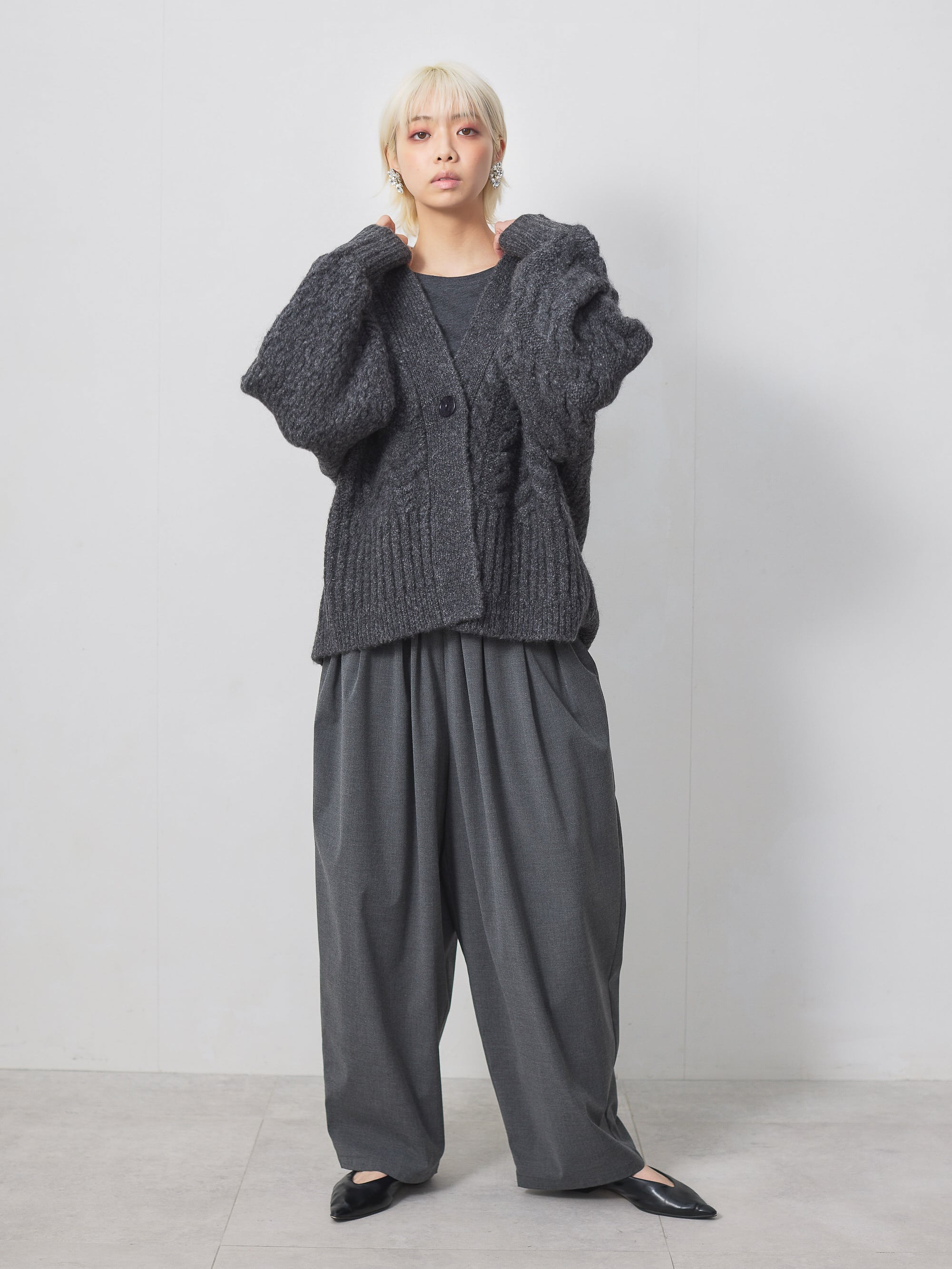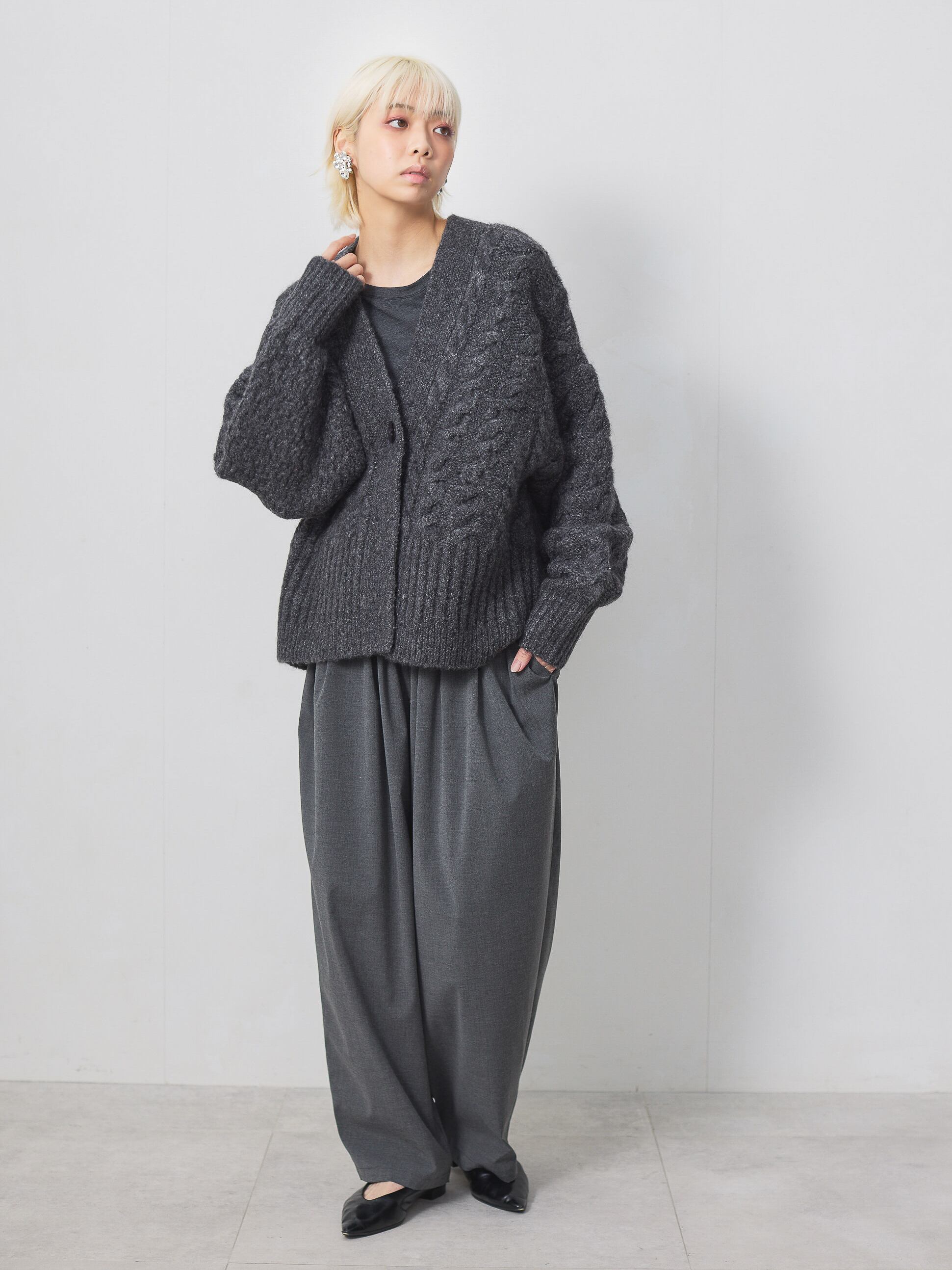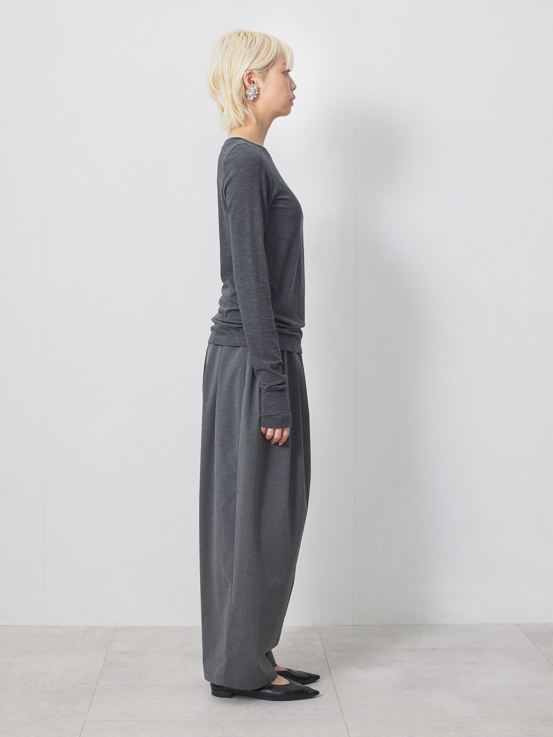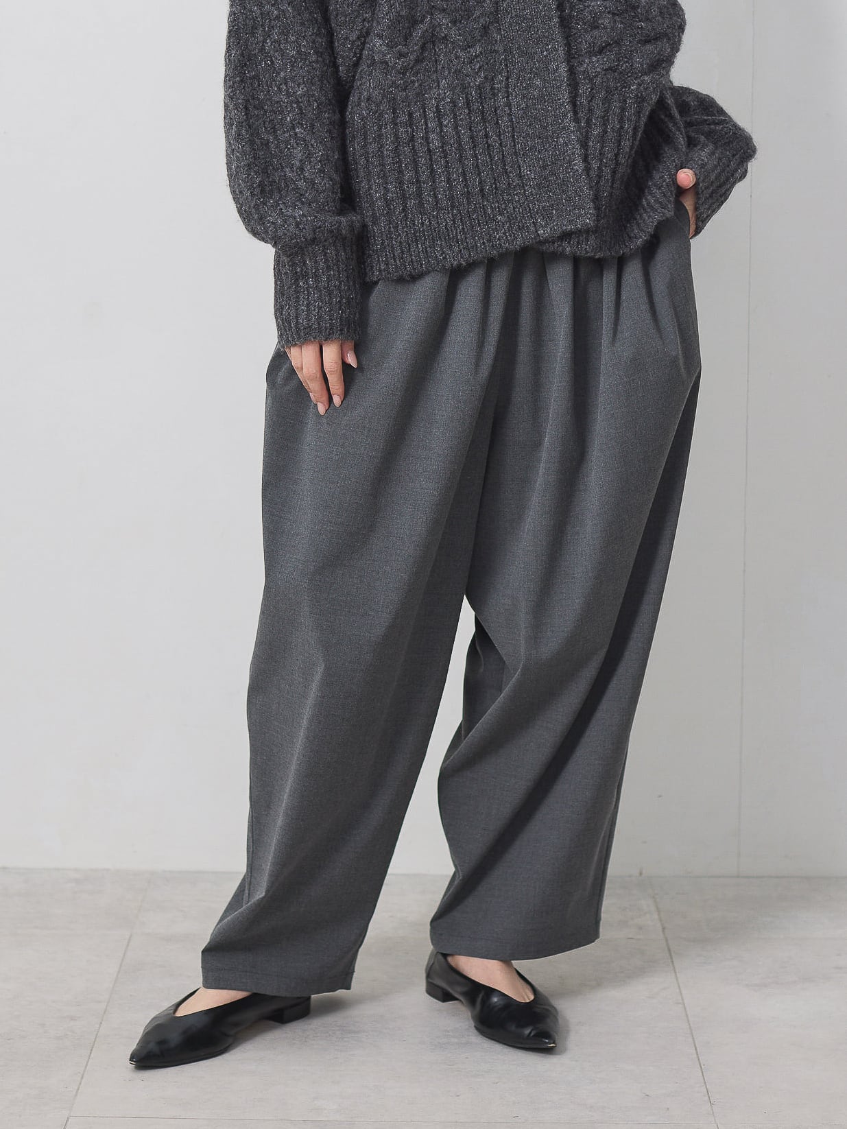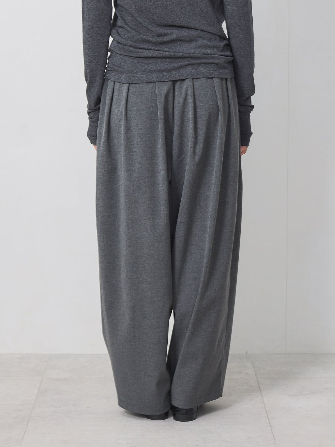 梳毛調の素材を使用した、タックとギャザーをたっぷり取ったワイドカーブパンツ。