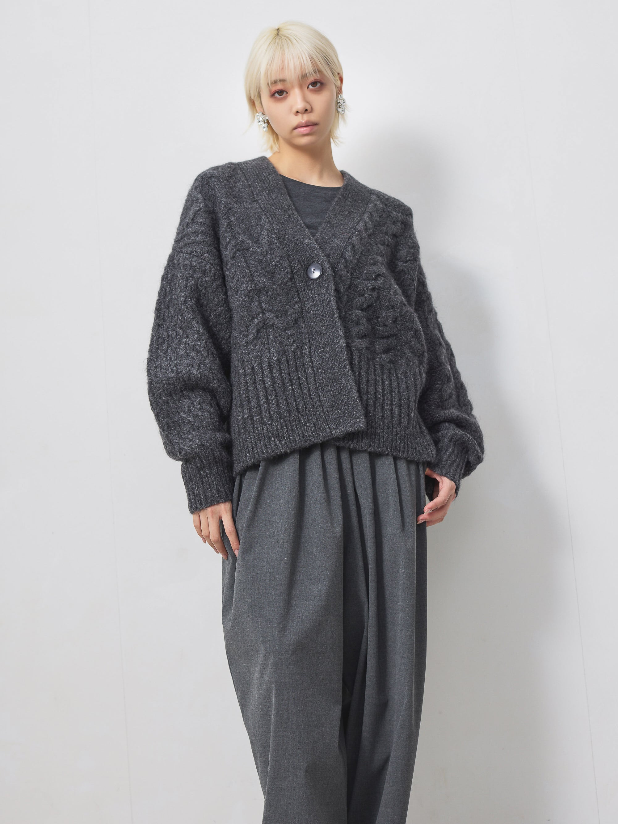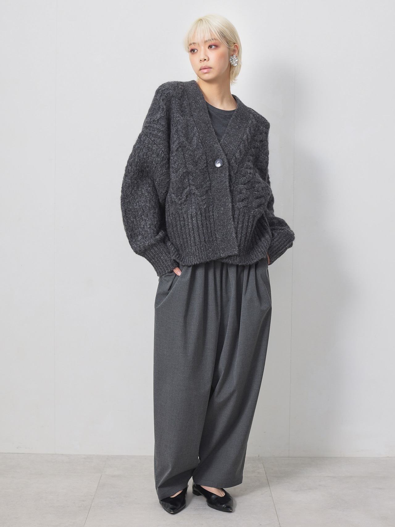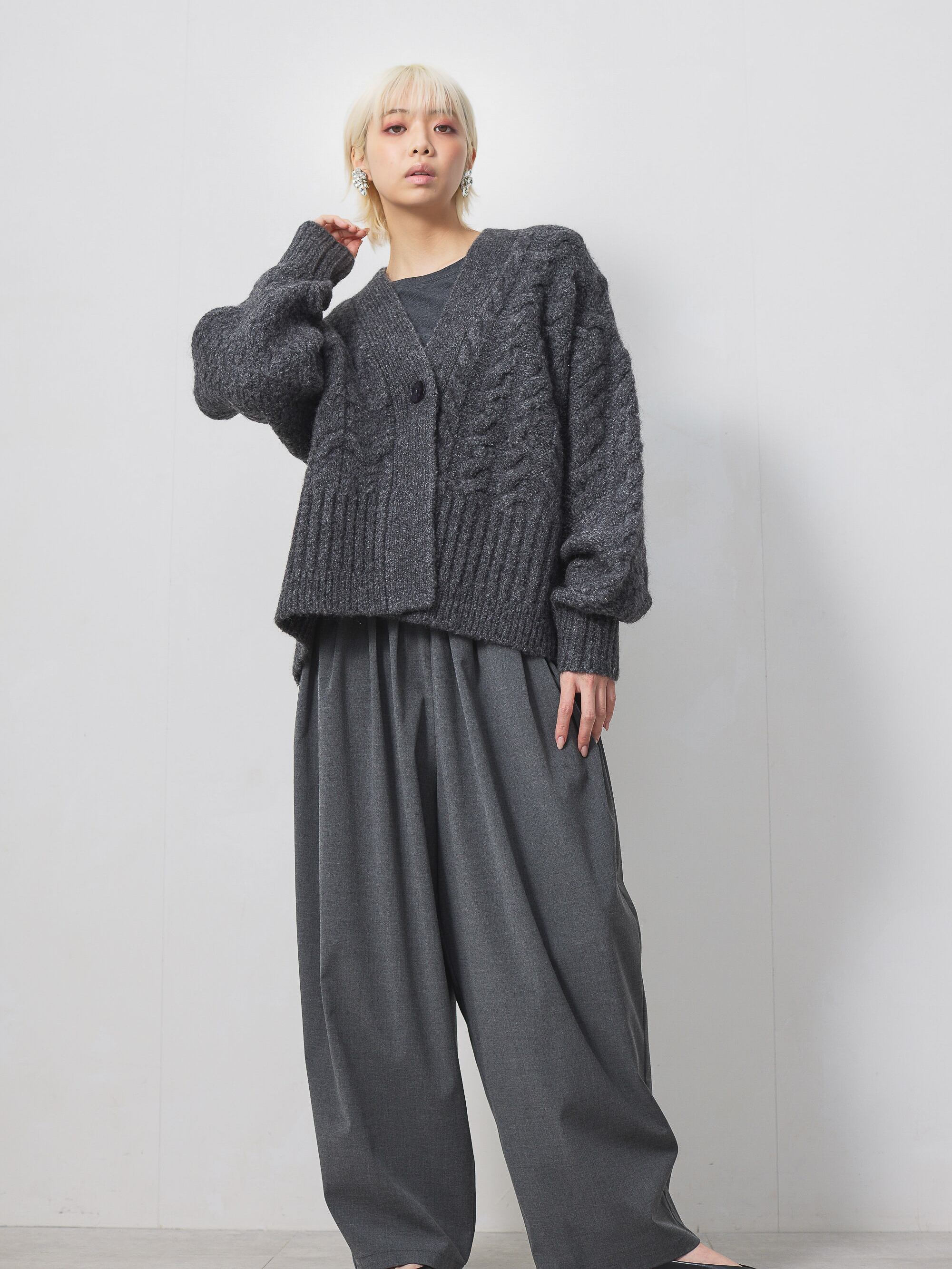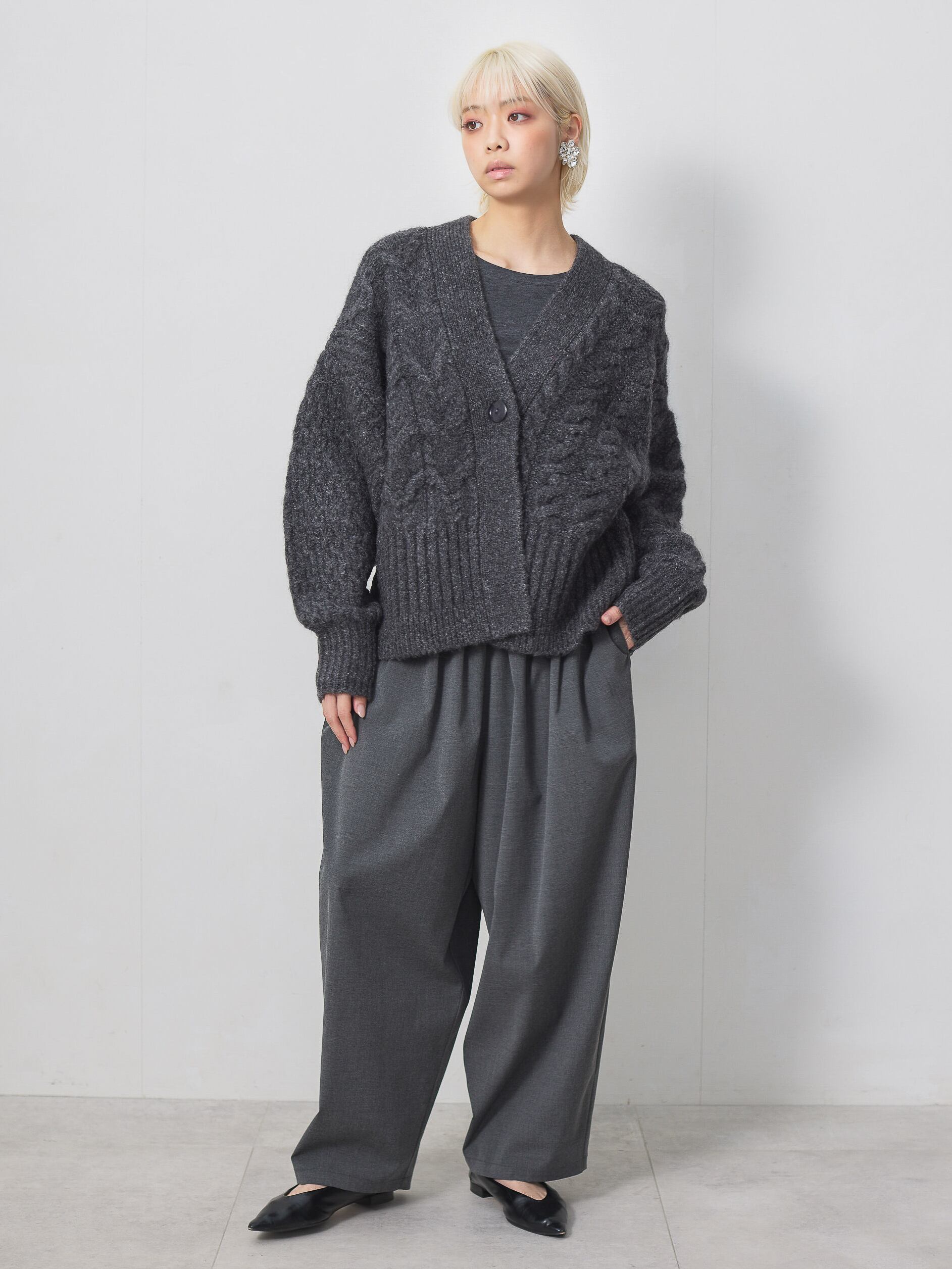 梳毛調の素材を使用した、タックとギャザーをたっぷり取ったワイドカーブパンツ。