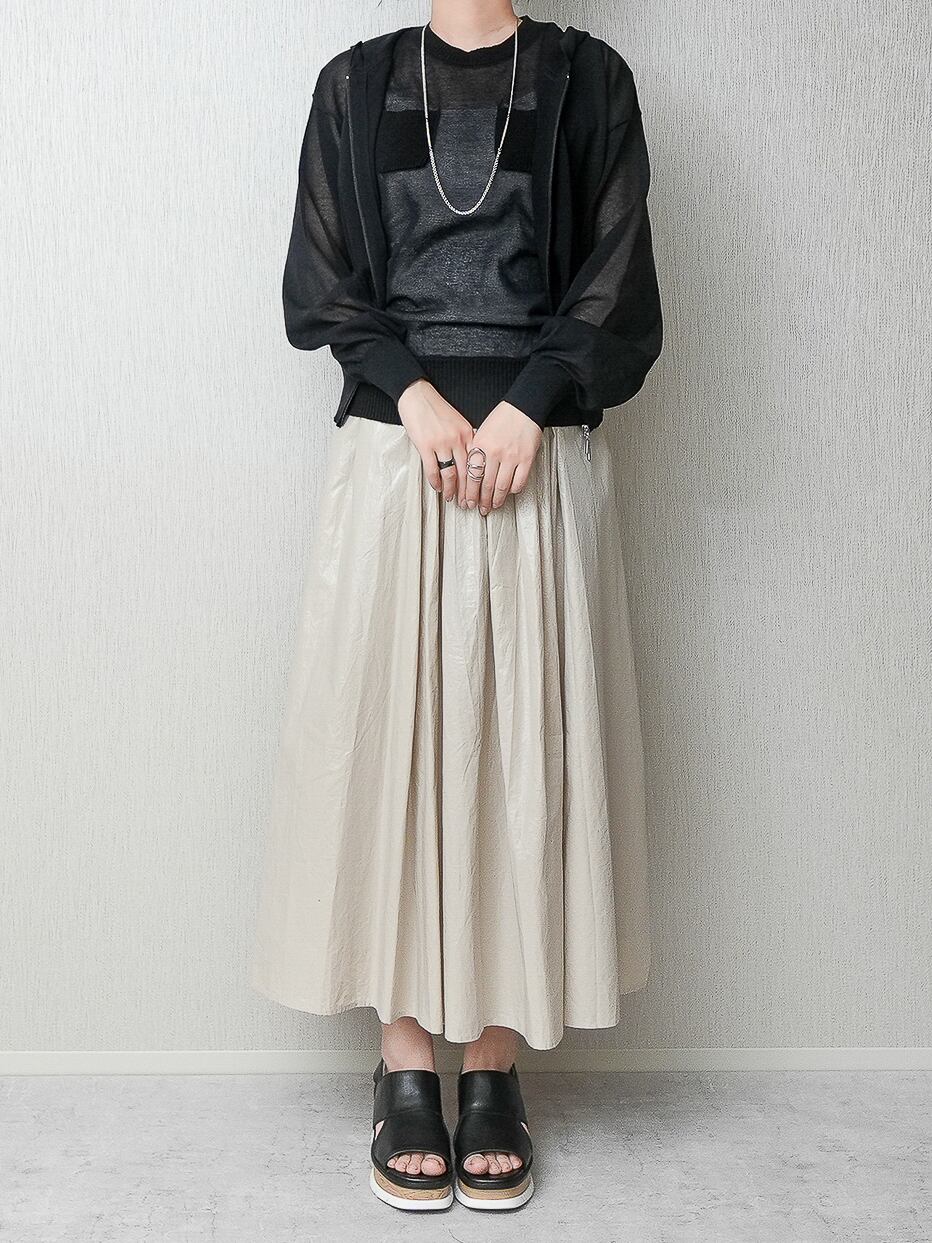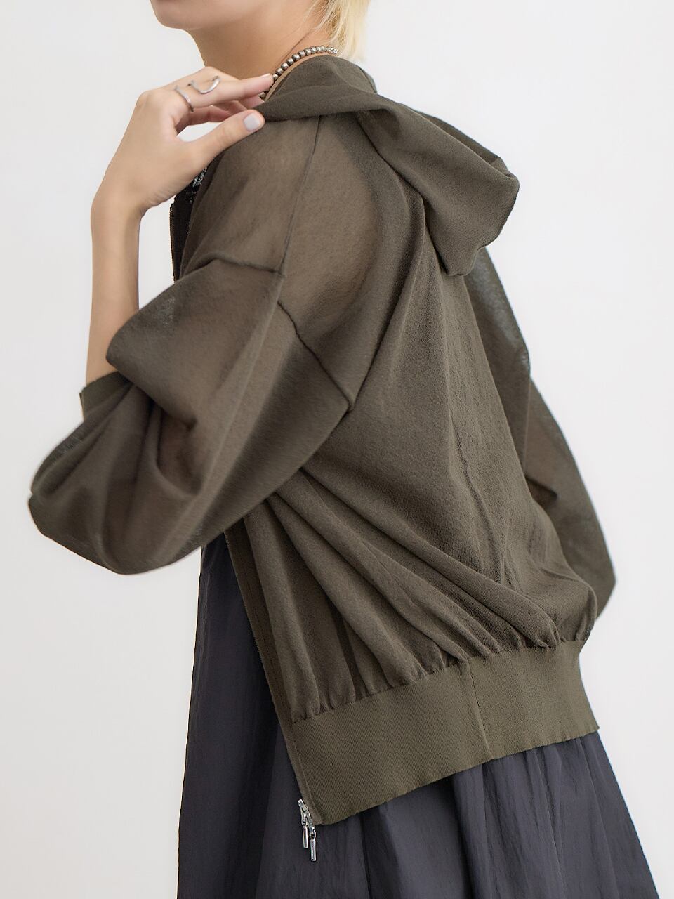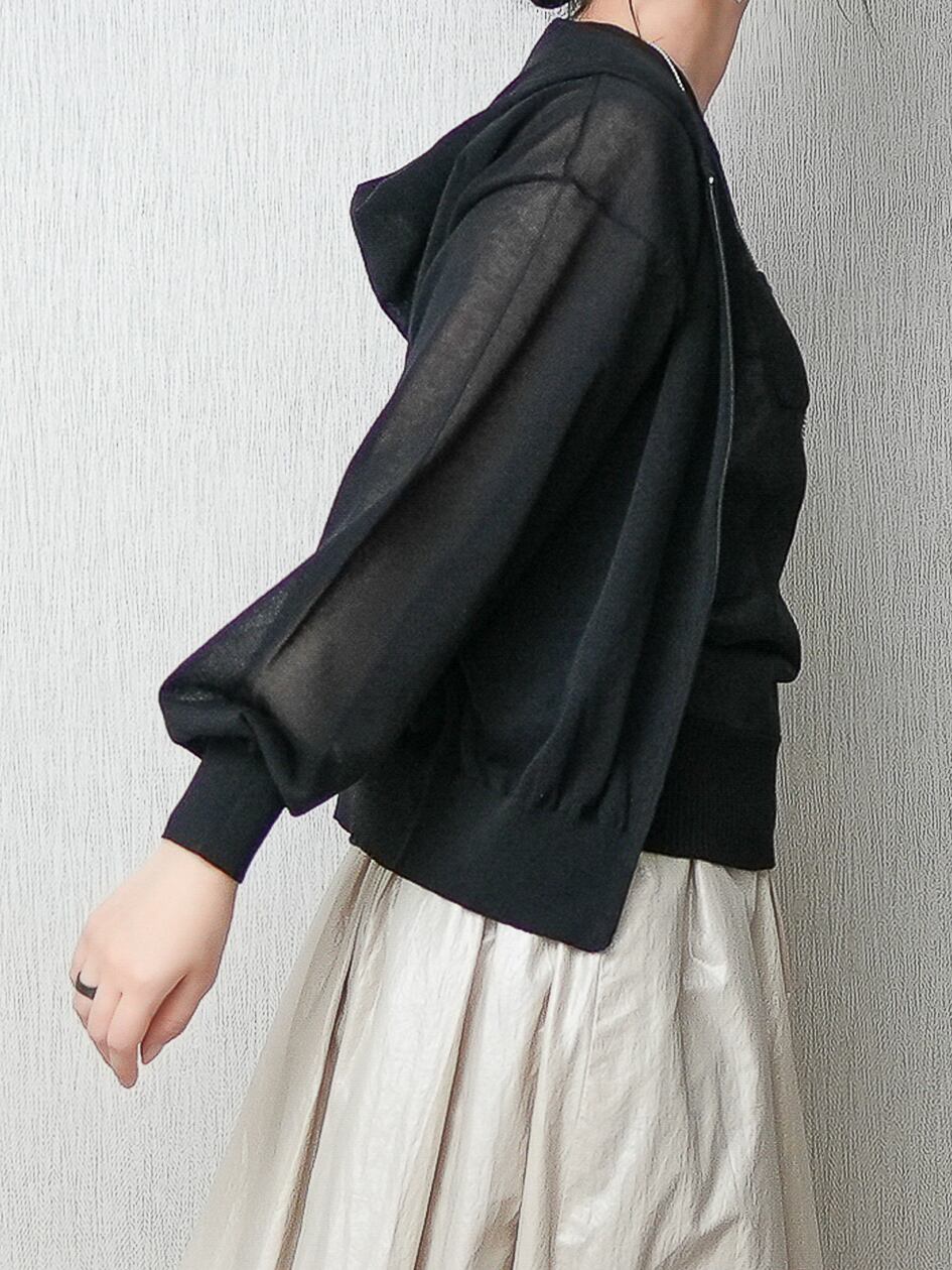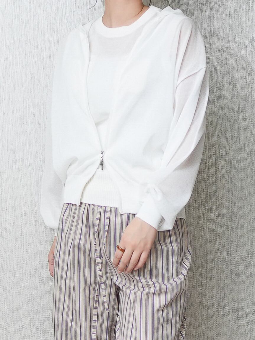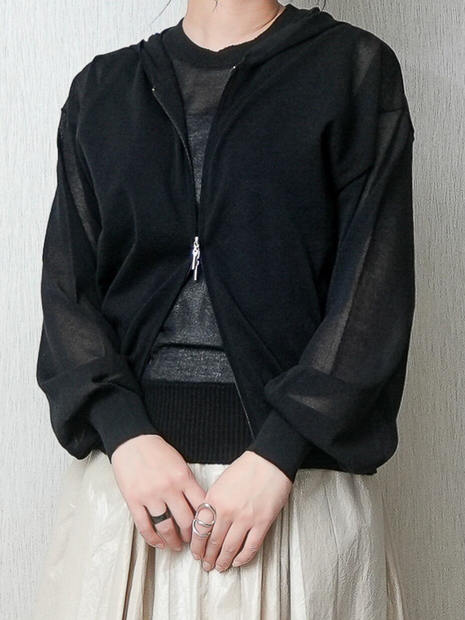 少し張りのあるシアーな素材感が特徴の、ジップアップニットパーカーです。