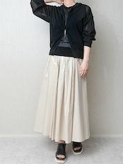 体のラインがぼんやりするくらいの絶妙な透け感なので、年代問わず楽しめるシアーアイテムだと思います。私はタンクトップの上に羽織っています!