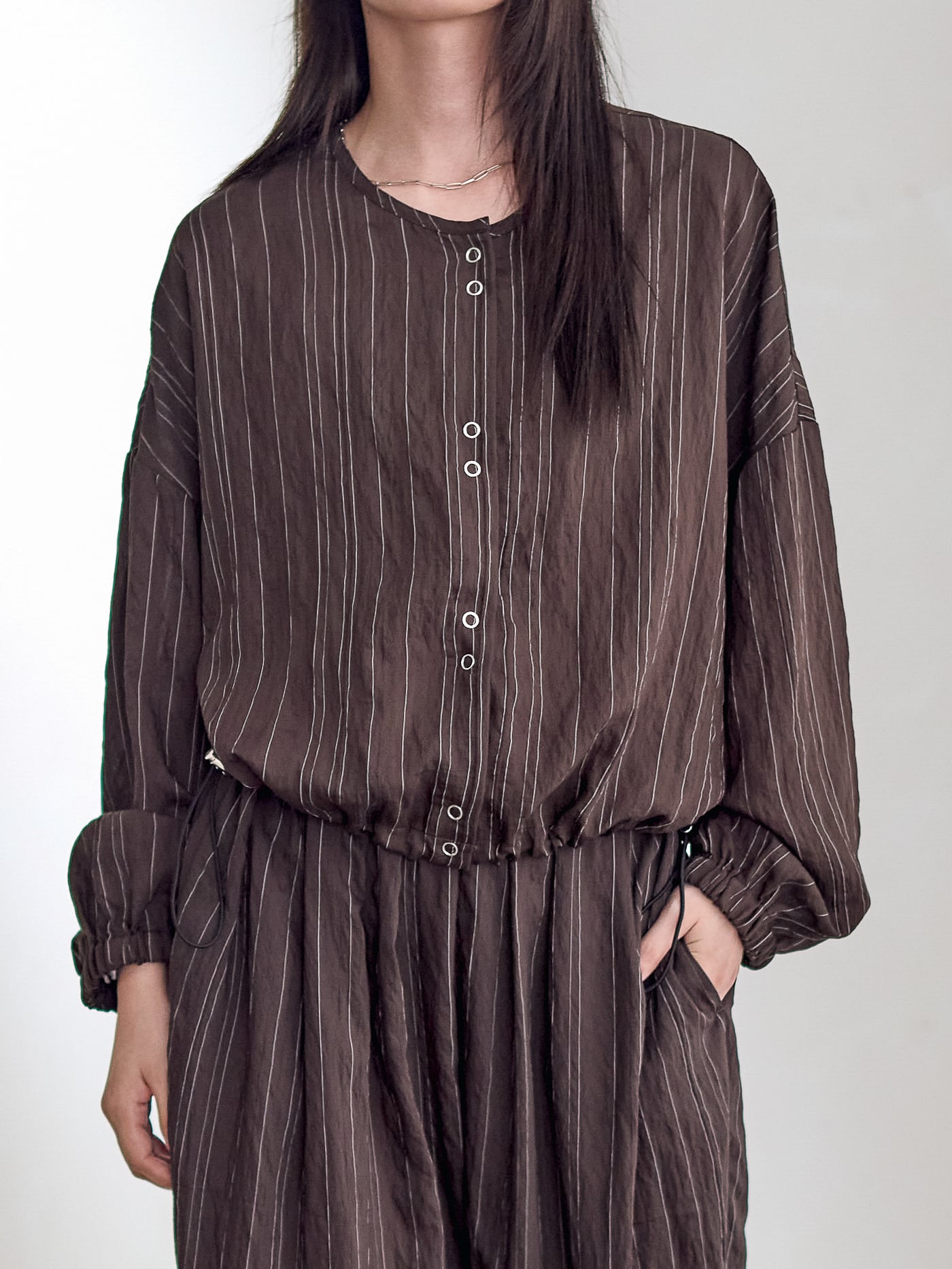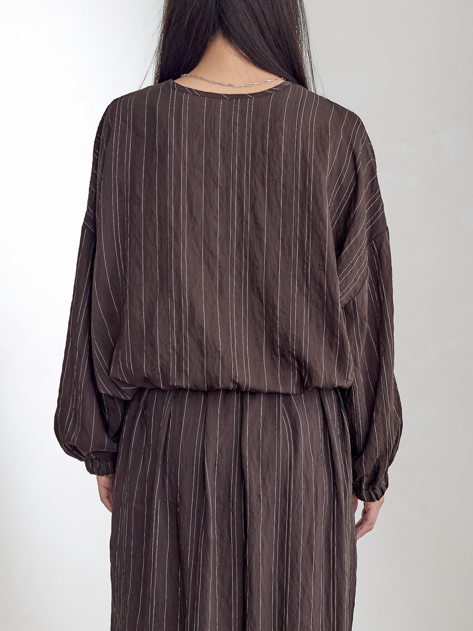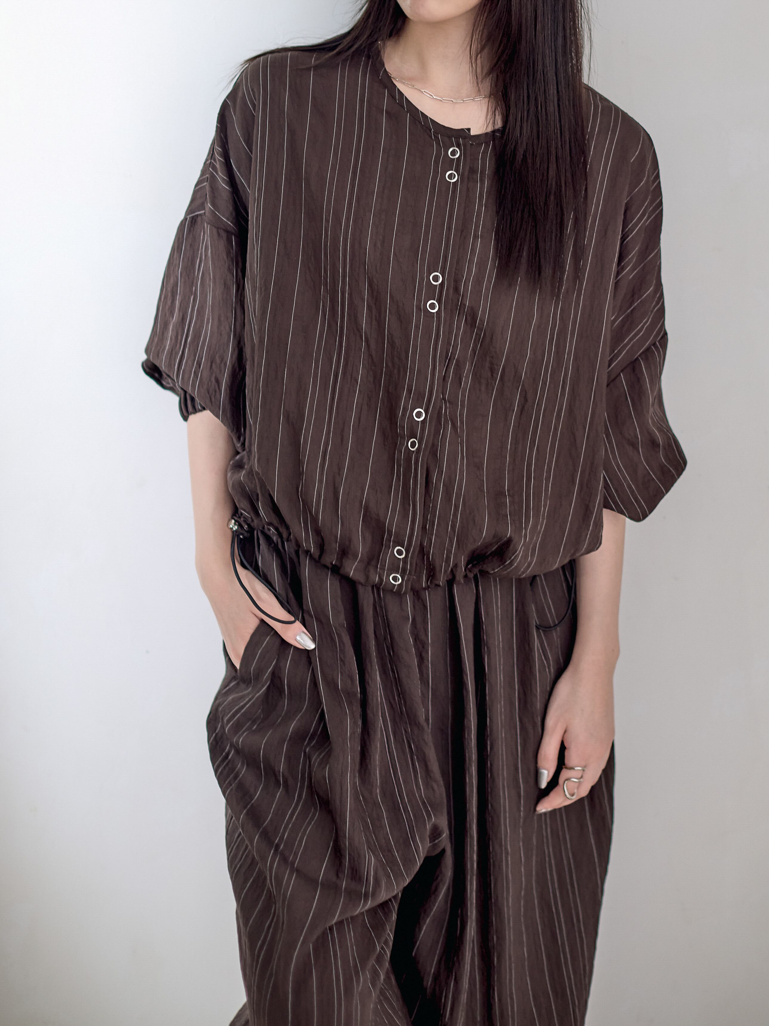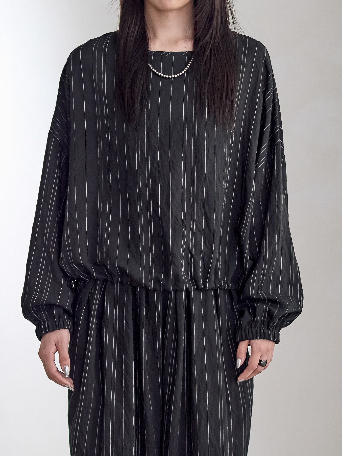 オーバーサイズで裾がドロストディールのブラウスプルオーバー。