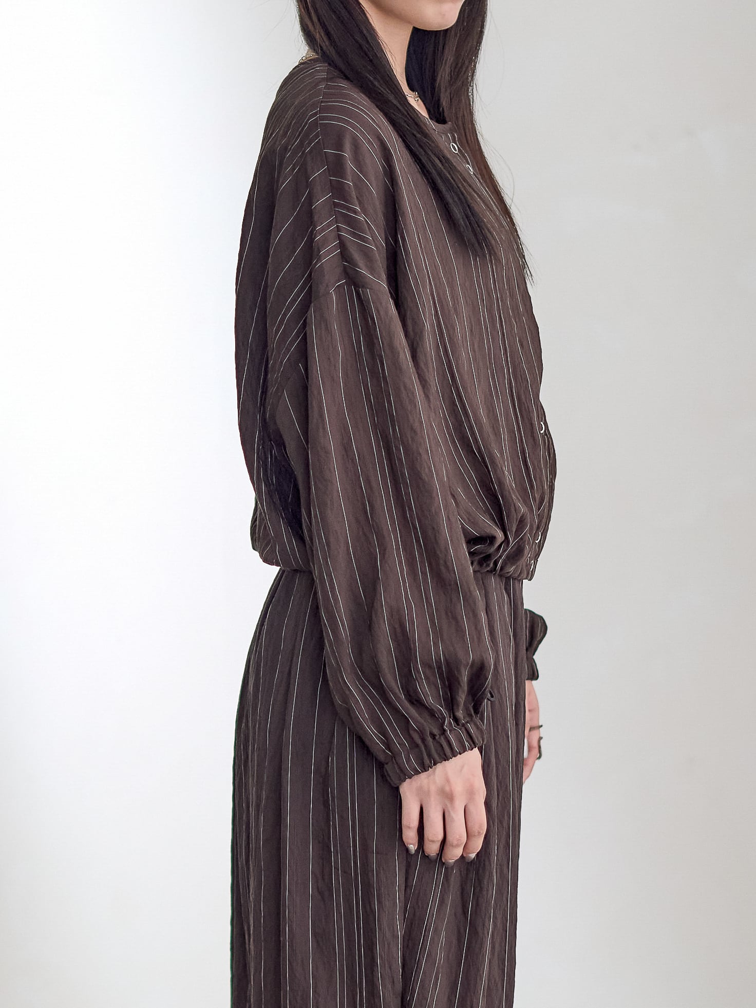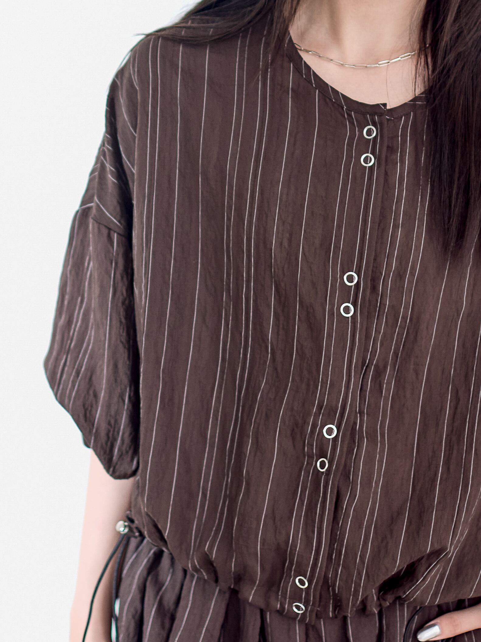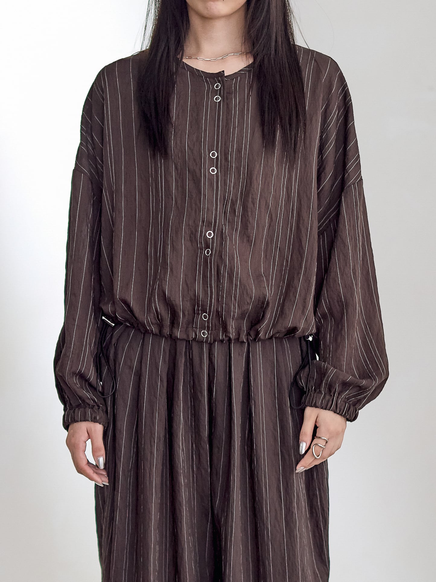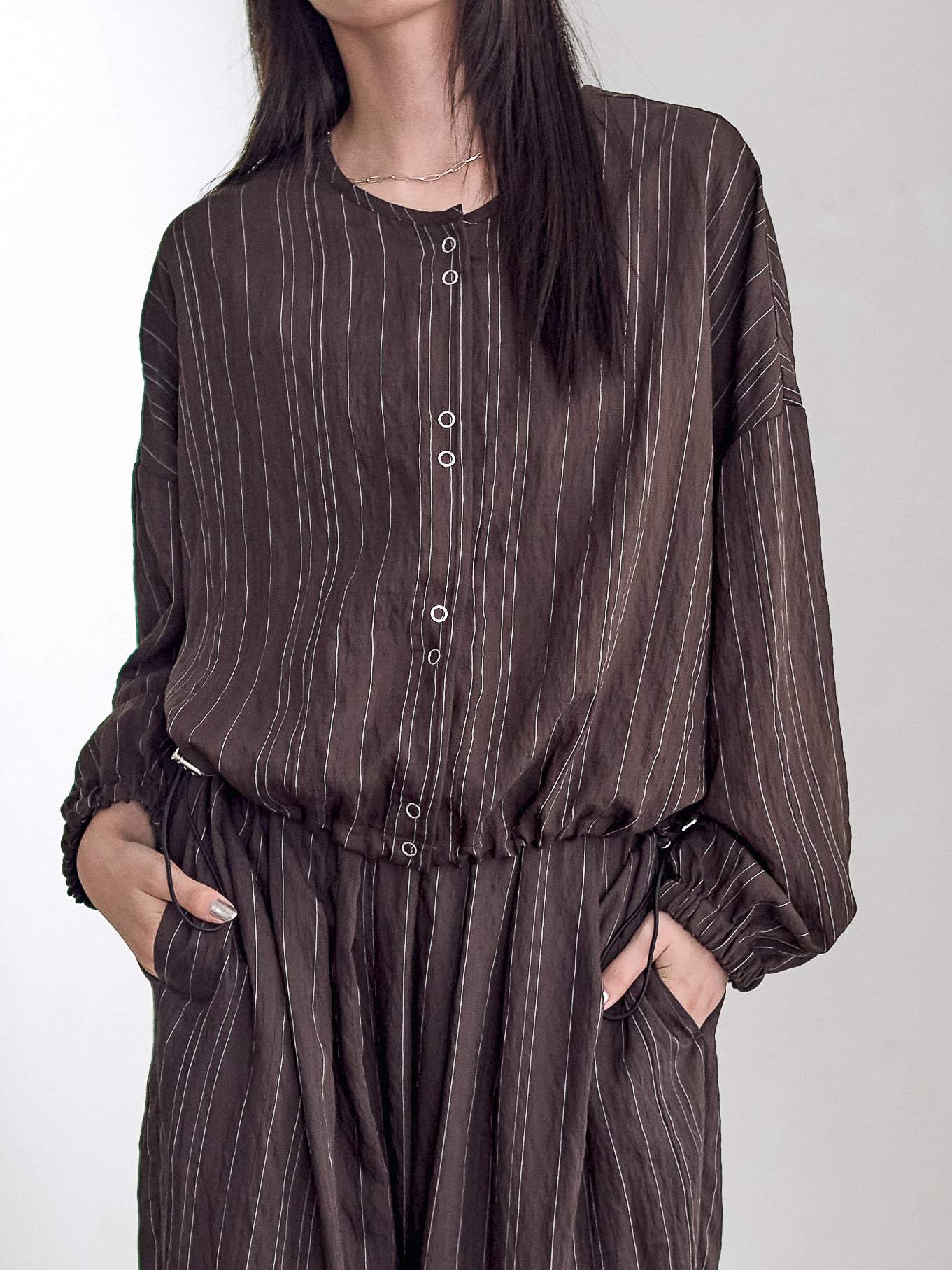 オーバーサイズで裾がドロストディールのブラウスプルオーバー。