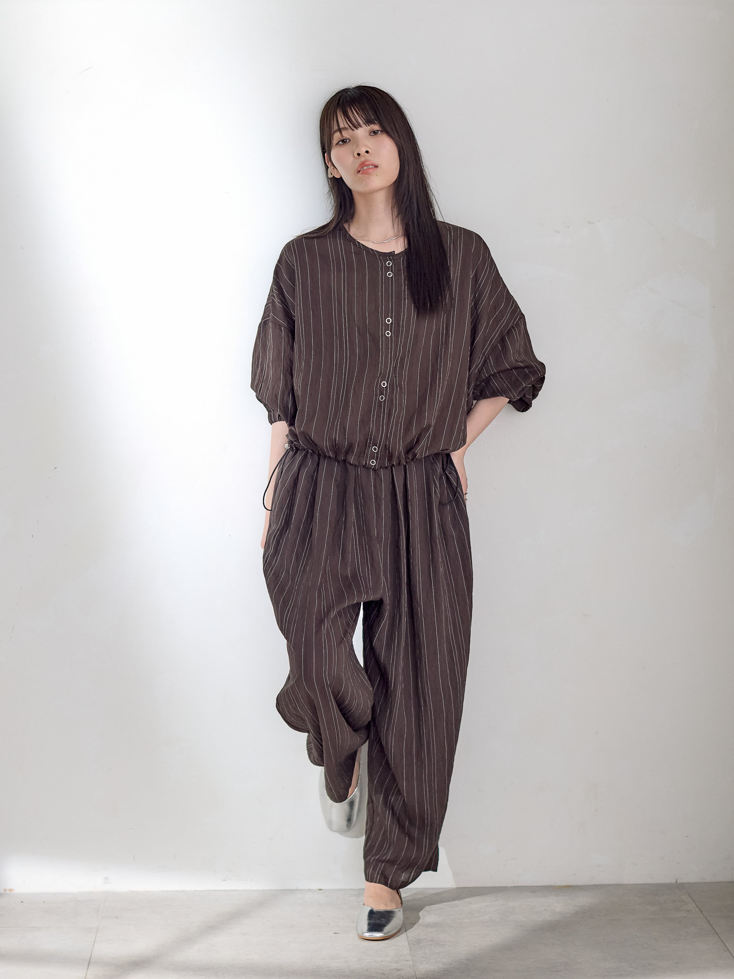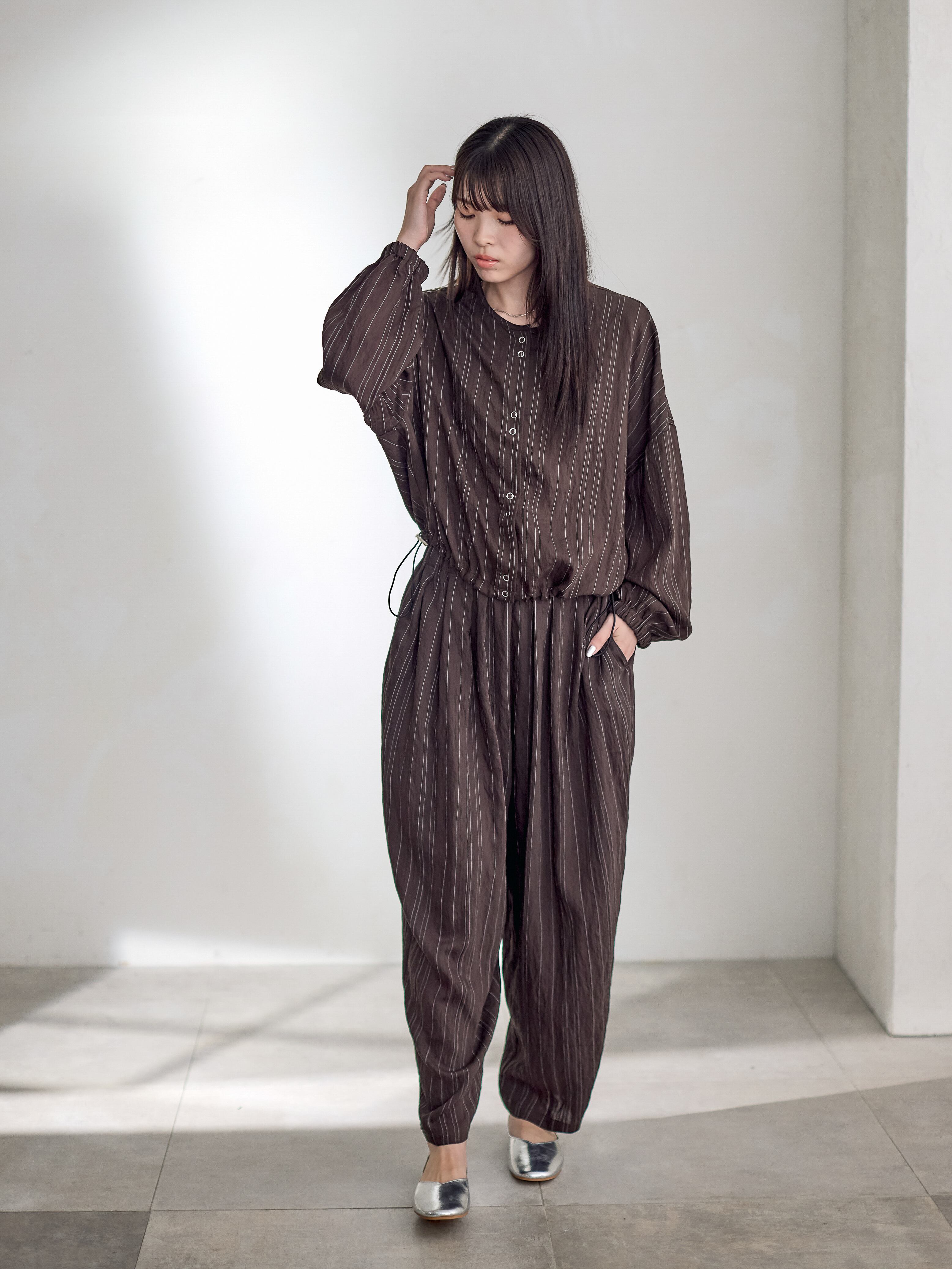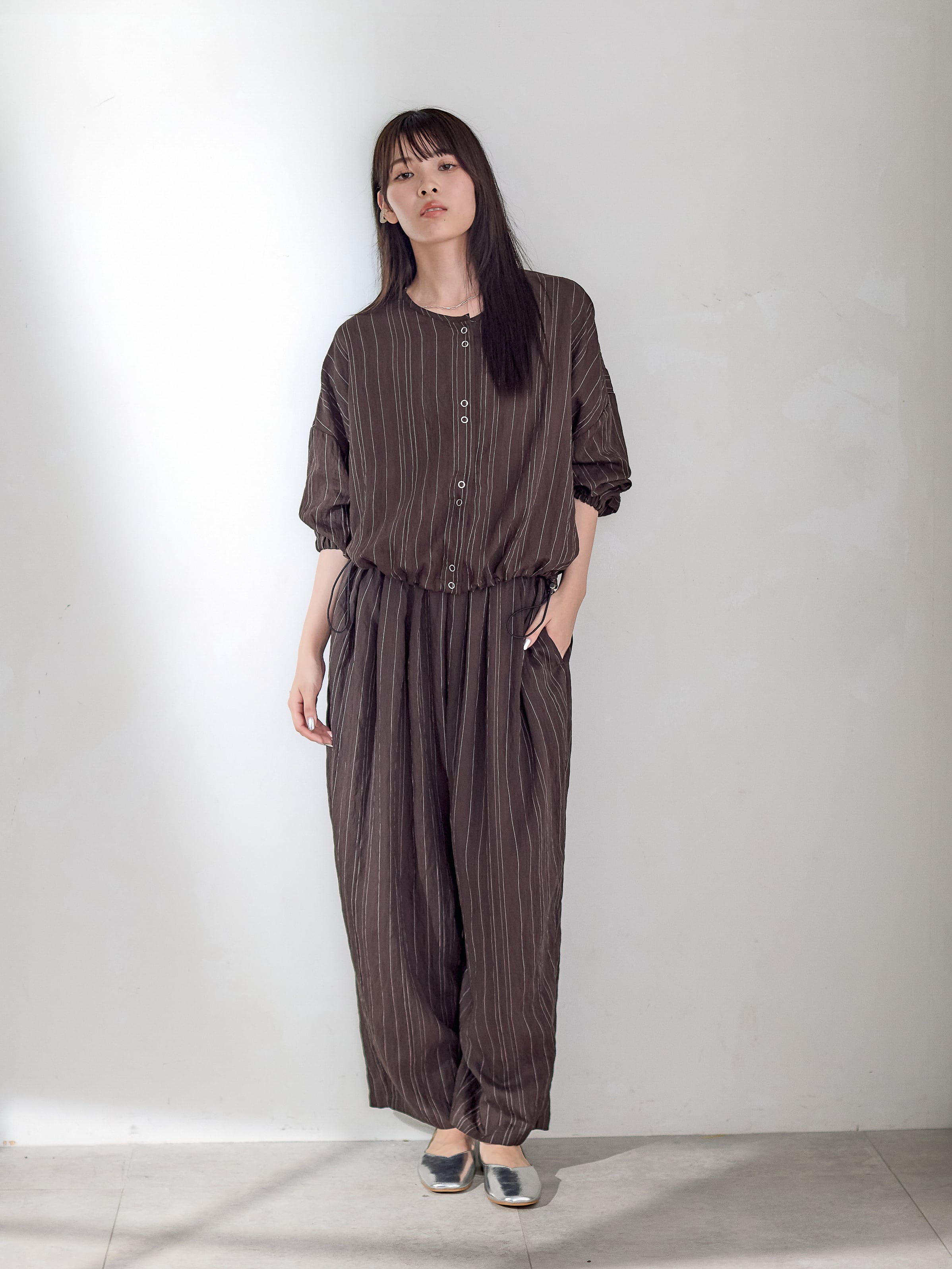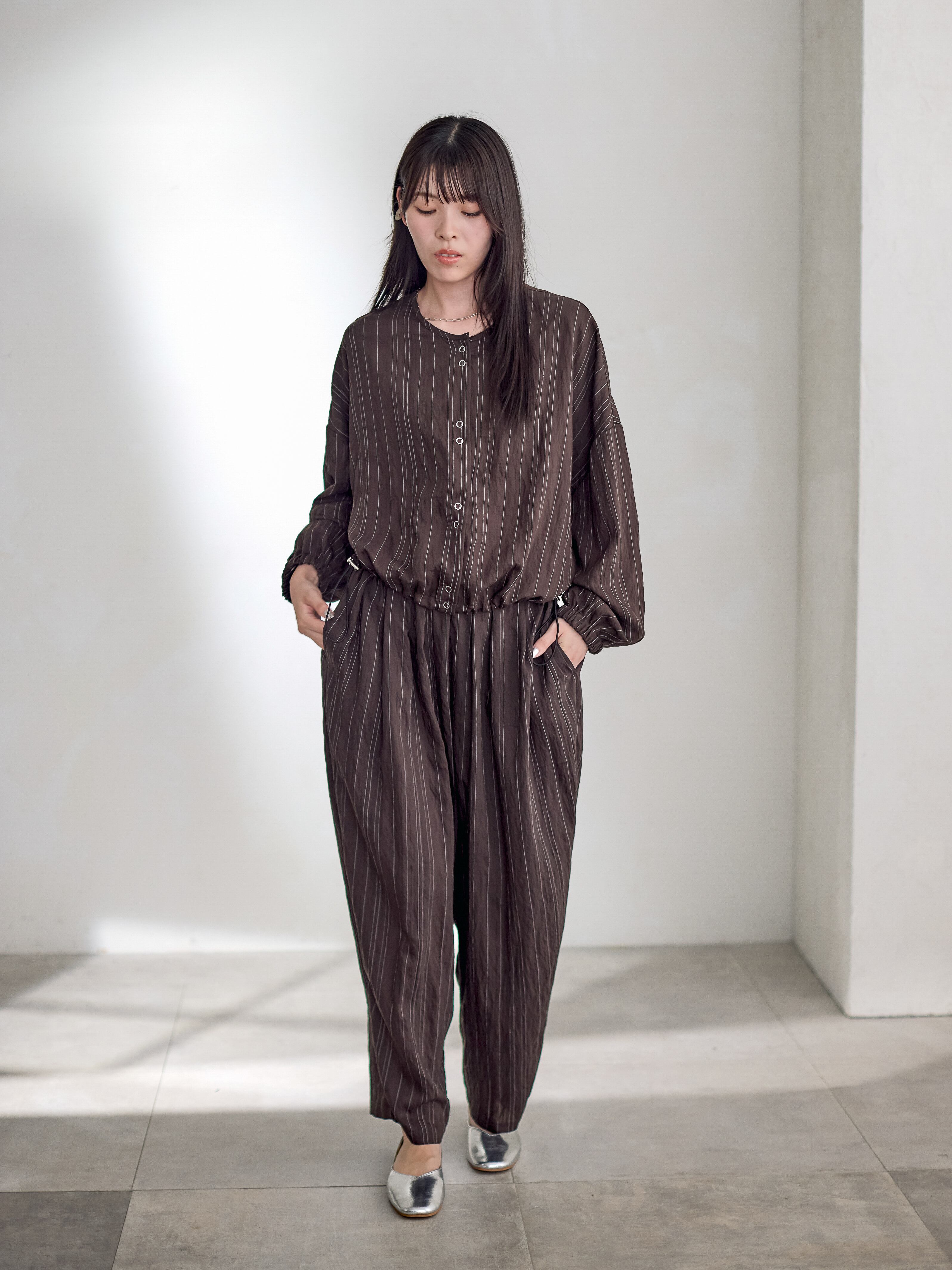同素材のパンツとのセットアップもすすめです。