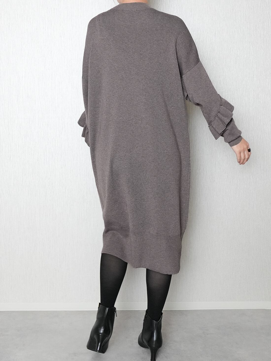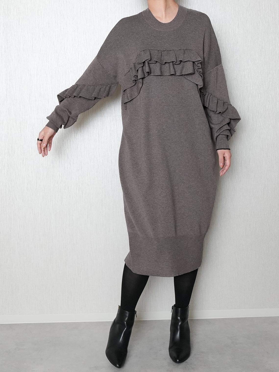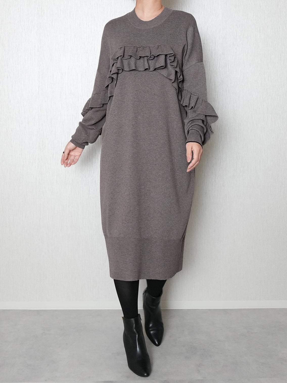 ゆったりしたシルエットとフリルディテールが特徴のニットドレスです。