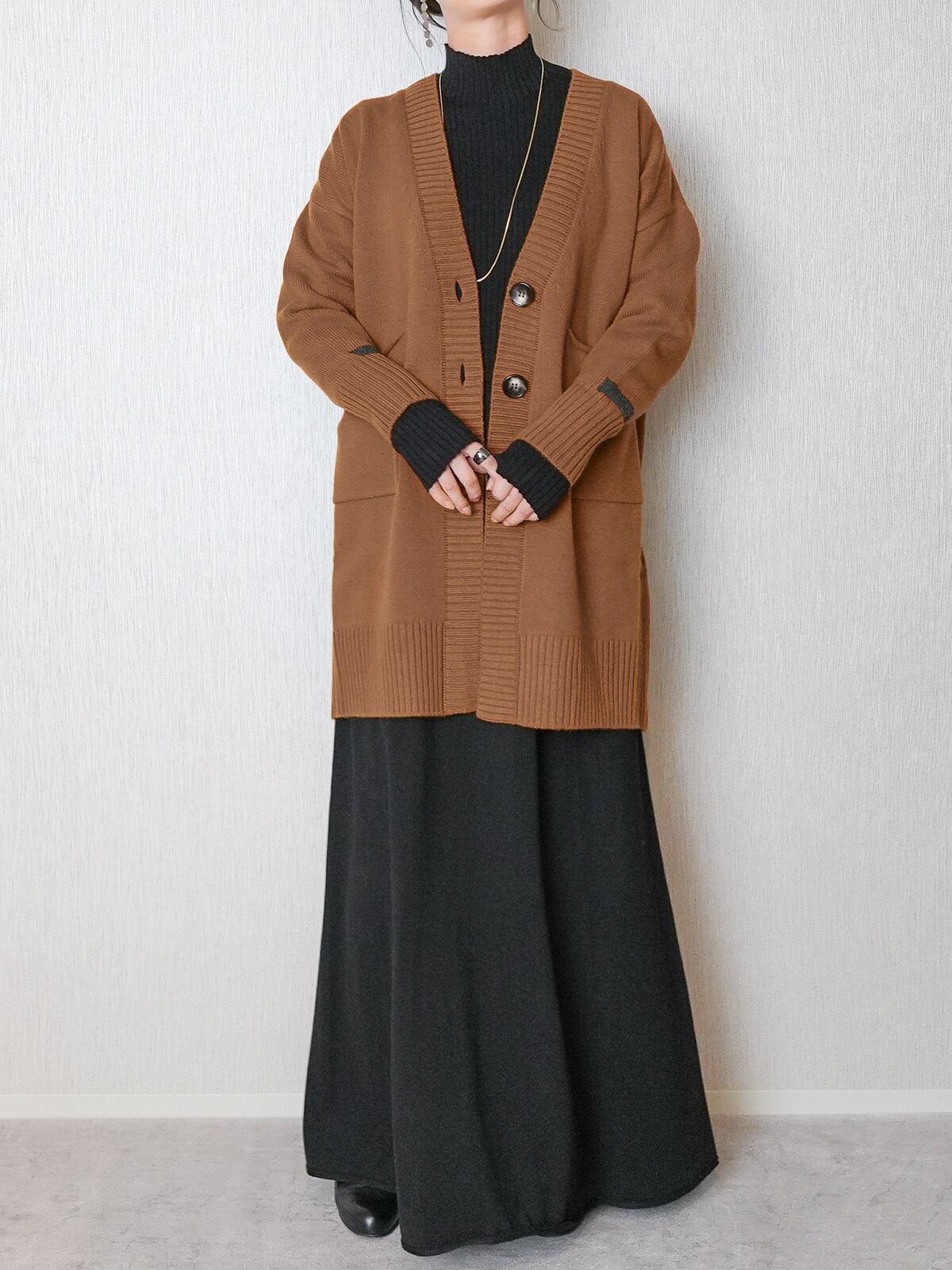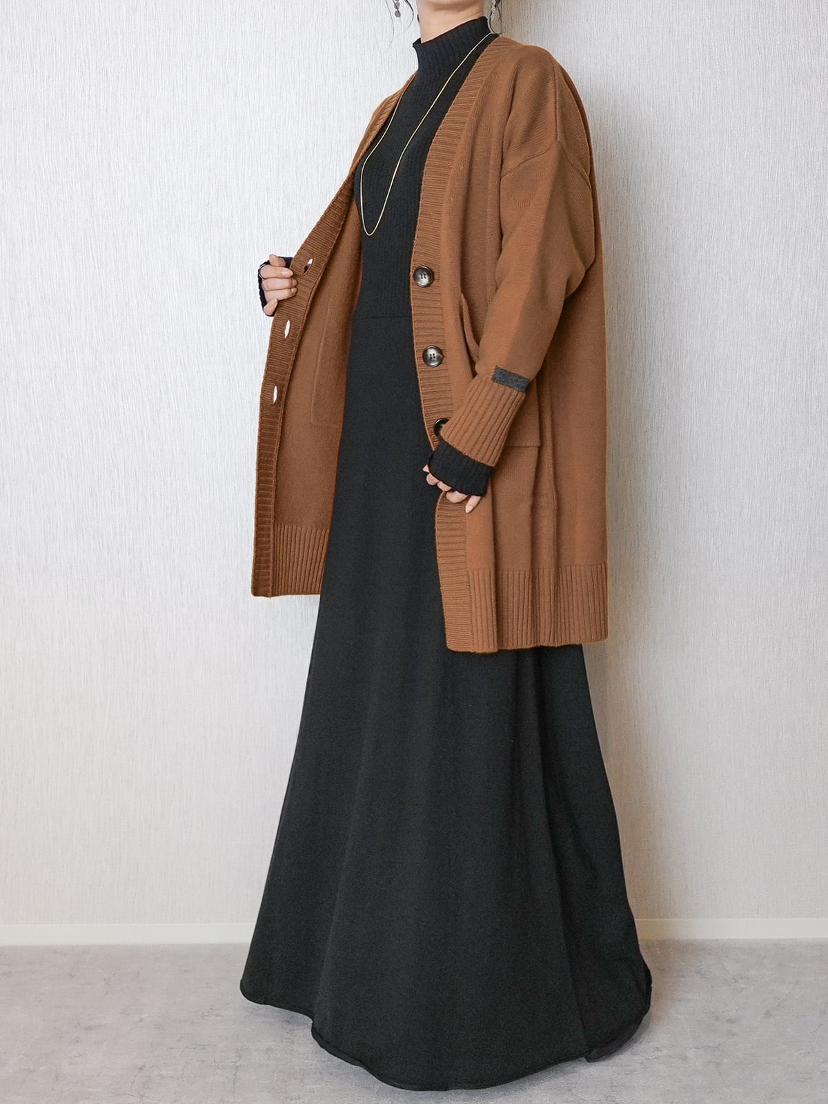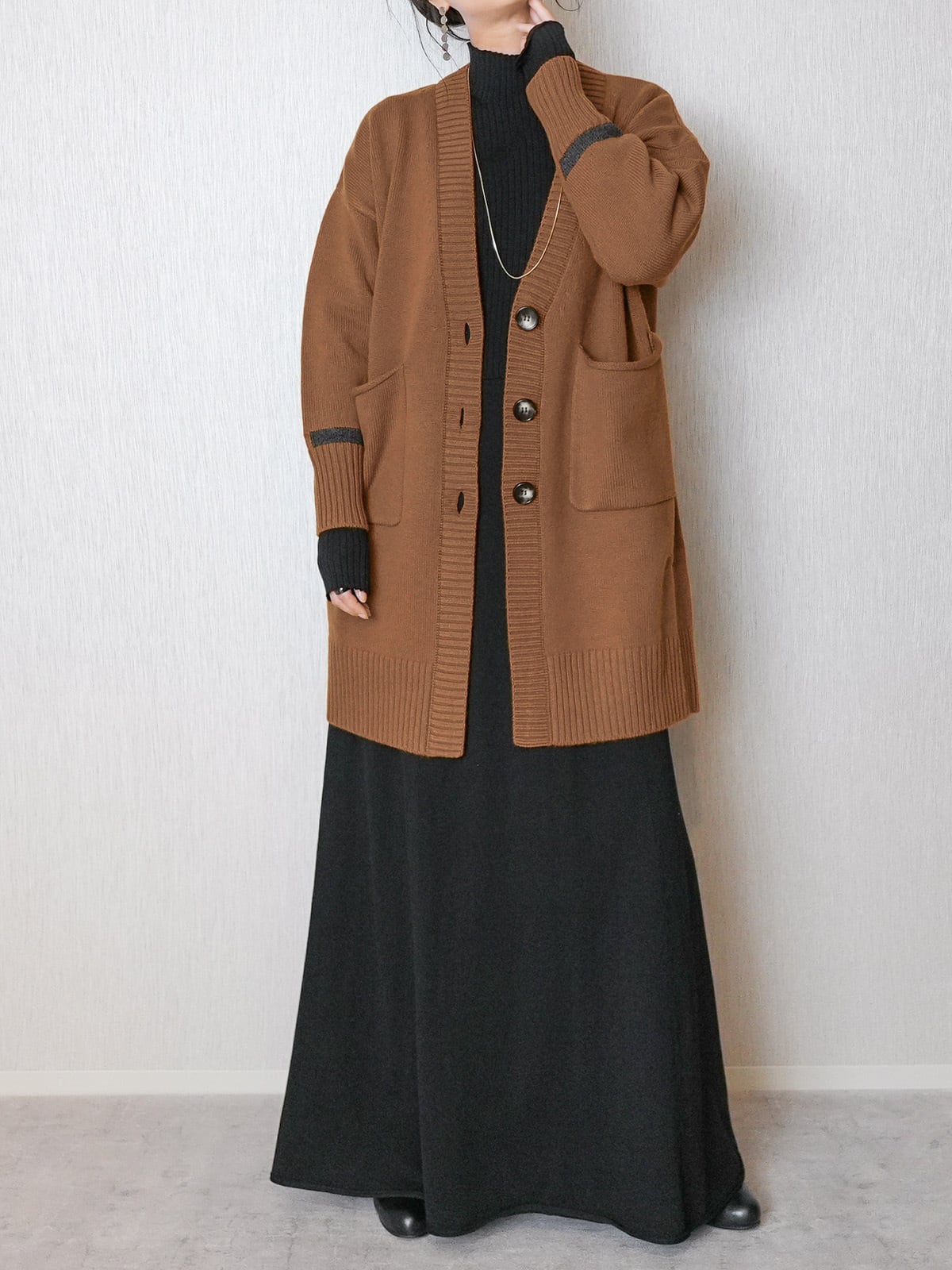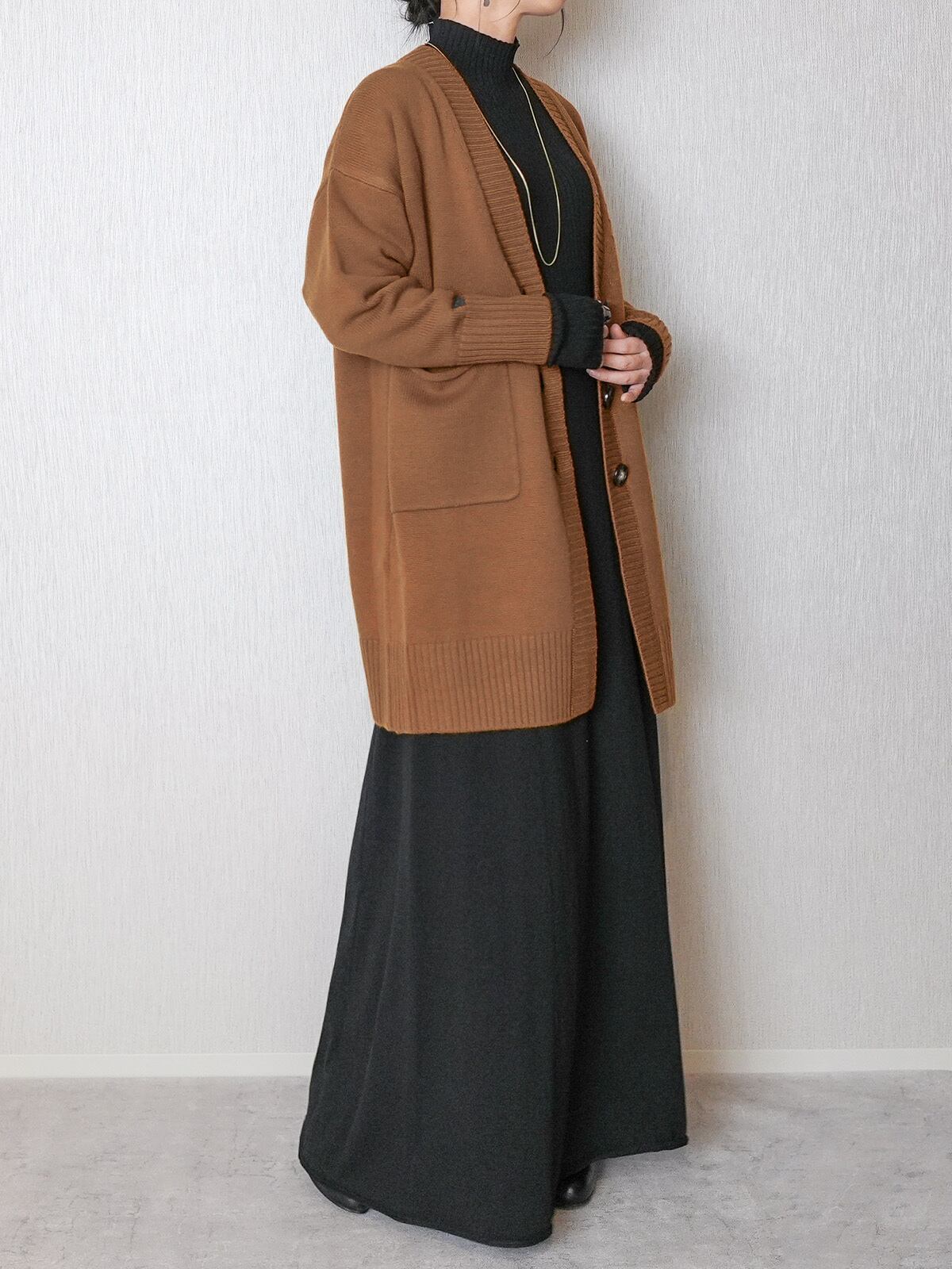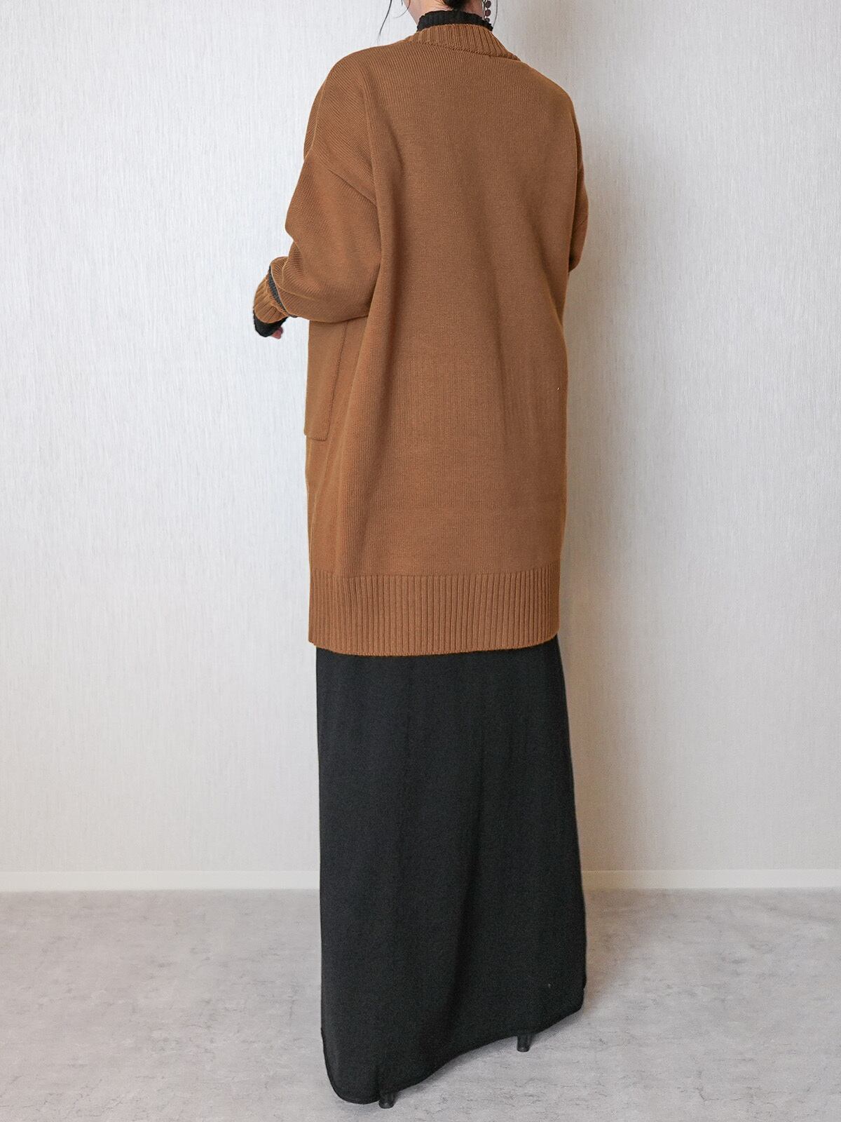 ゆったりした張りのあるシルエットが特徴のロングカーディガン。