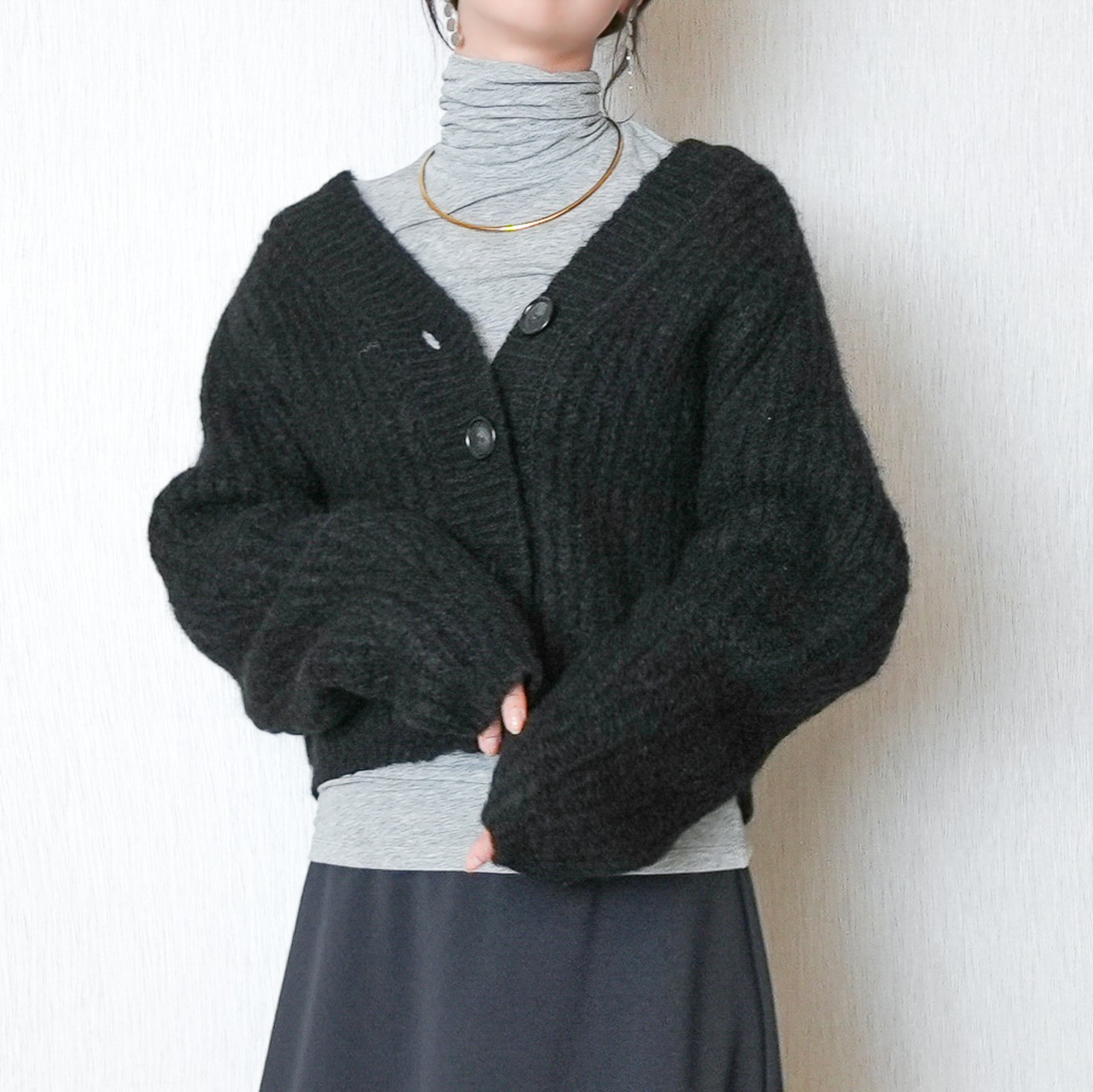 モヘア混ローゲージVネックニットカーディガン / ブラック無地