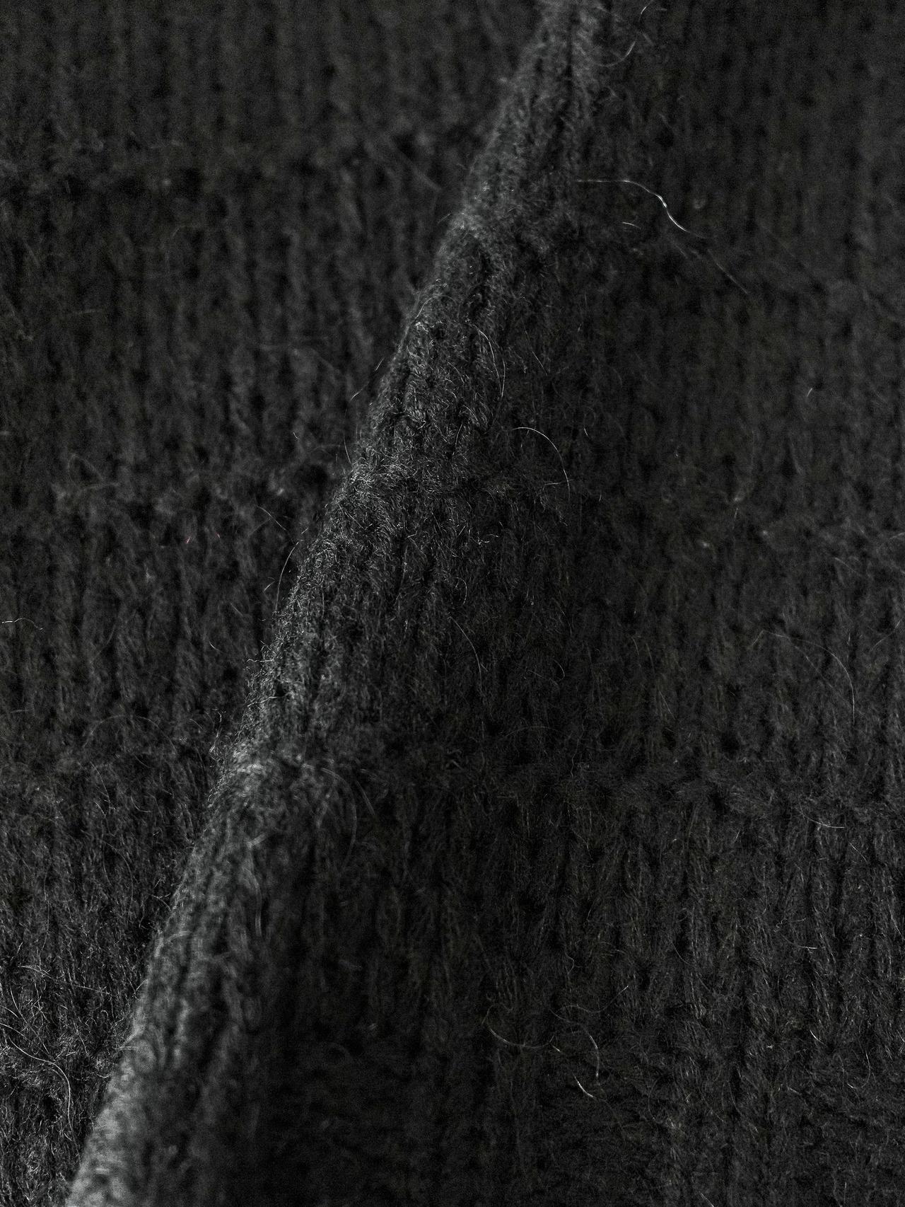 細いモヘア混の糸を多本取りした編地で仕立てており