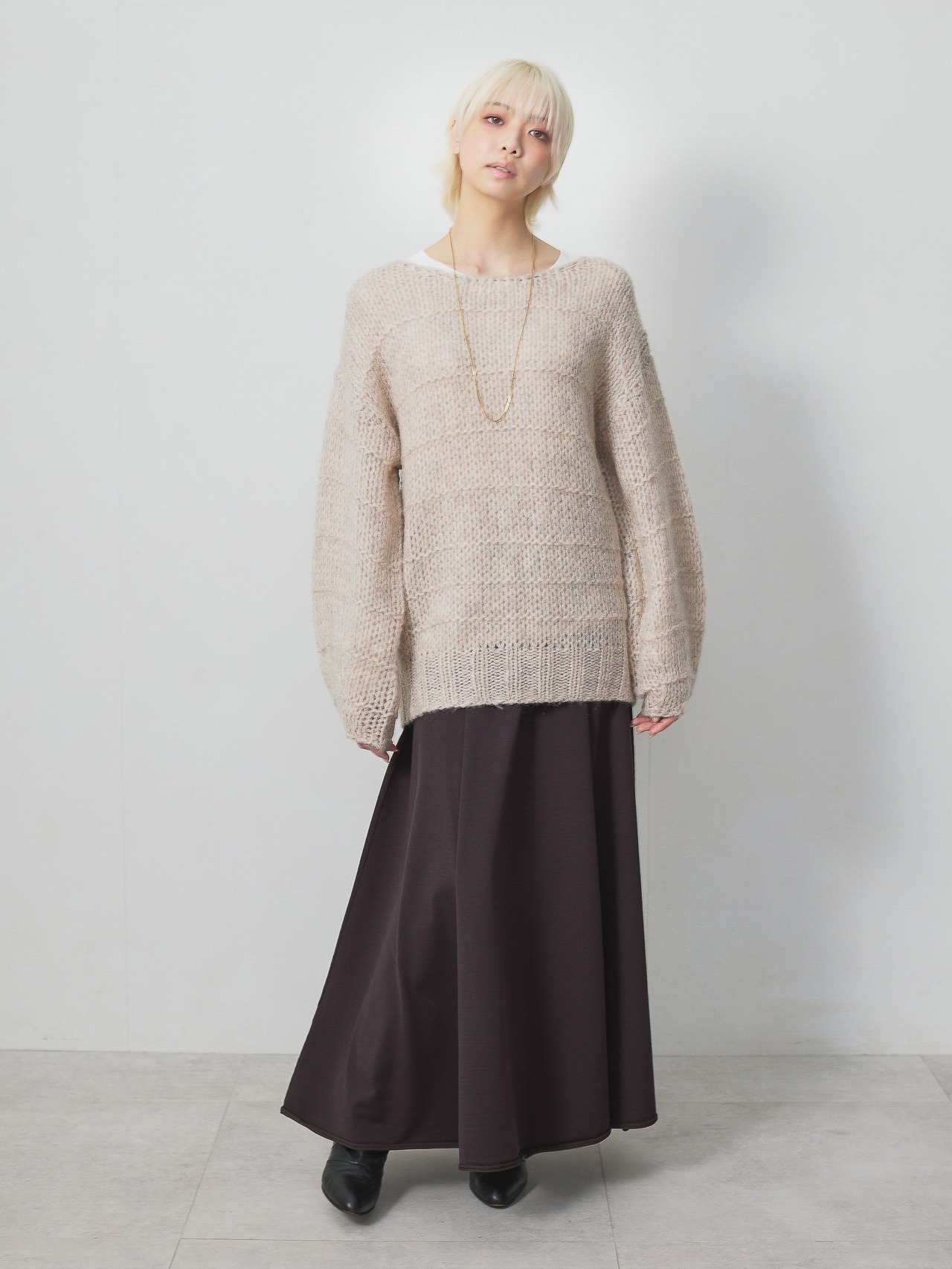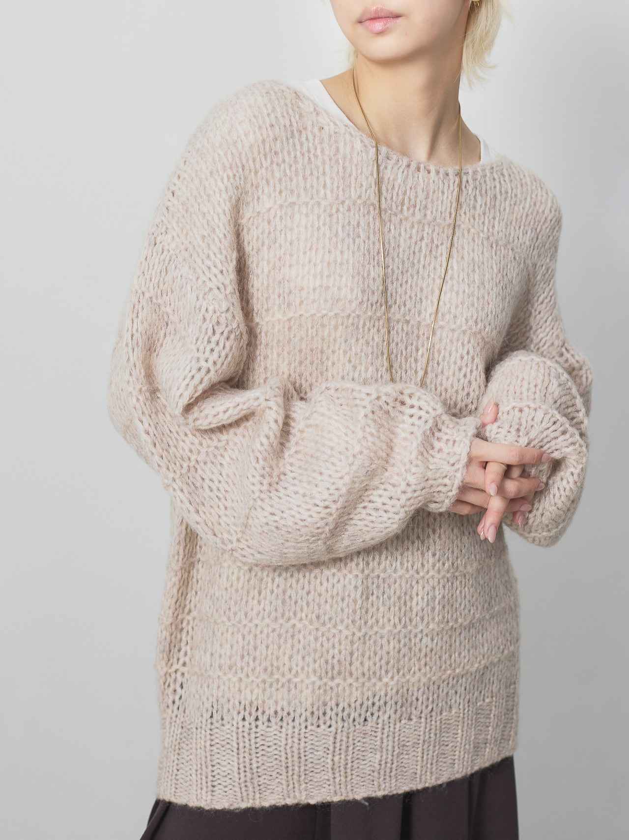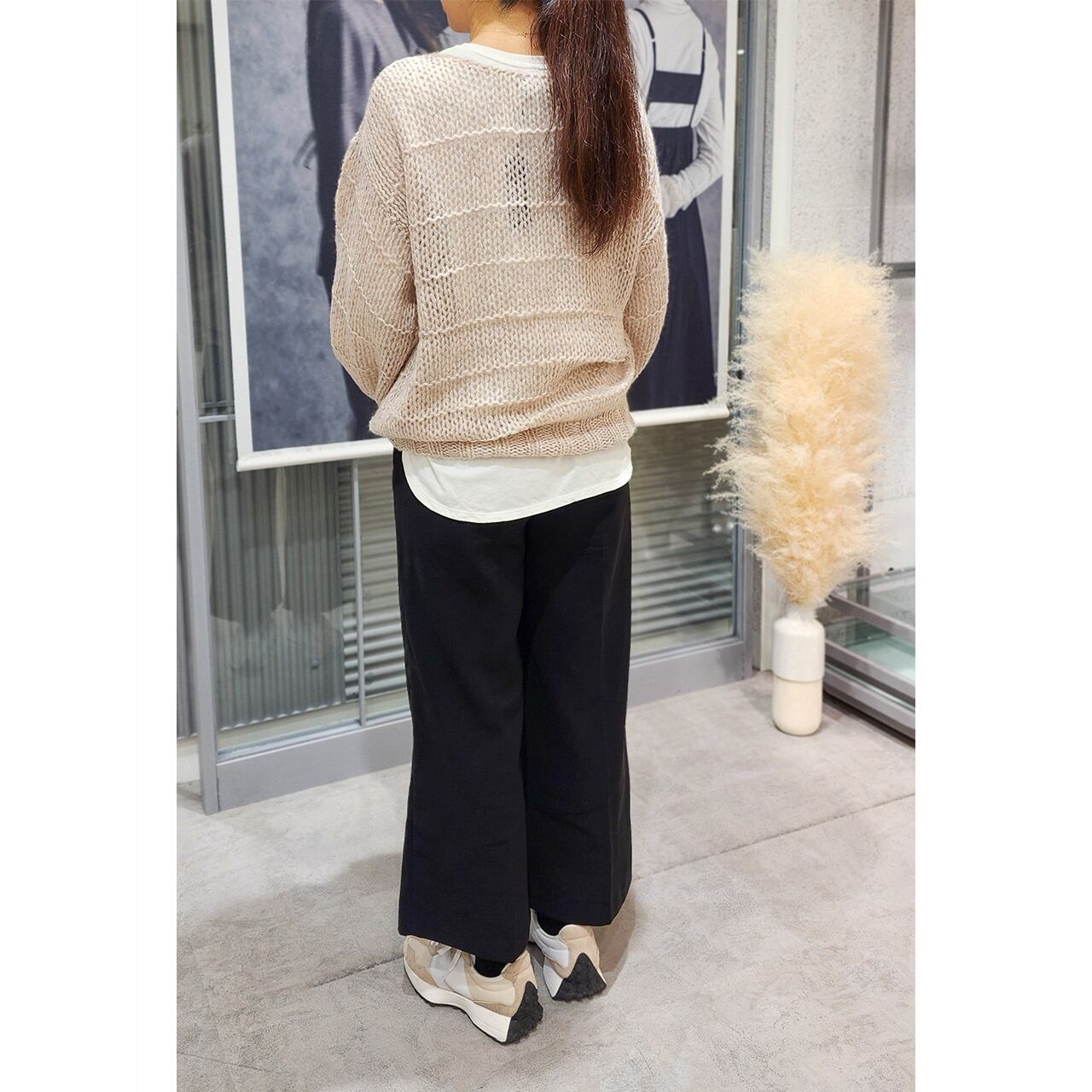 ローゲージの透ける組織が特徴のニットプルオーバーです。