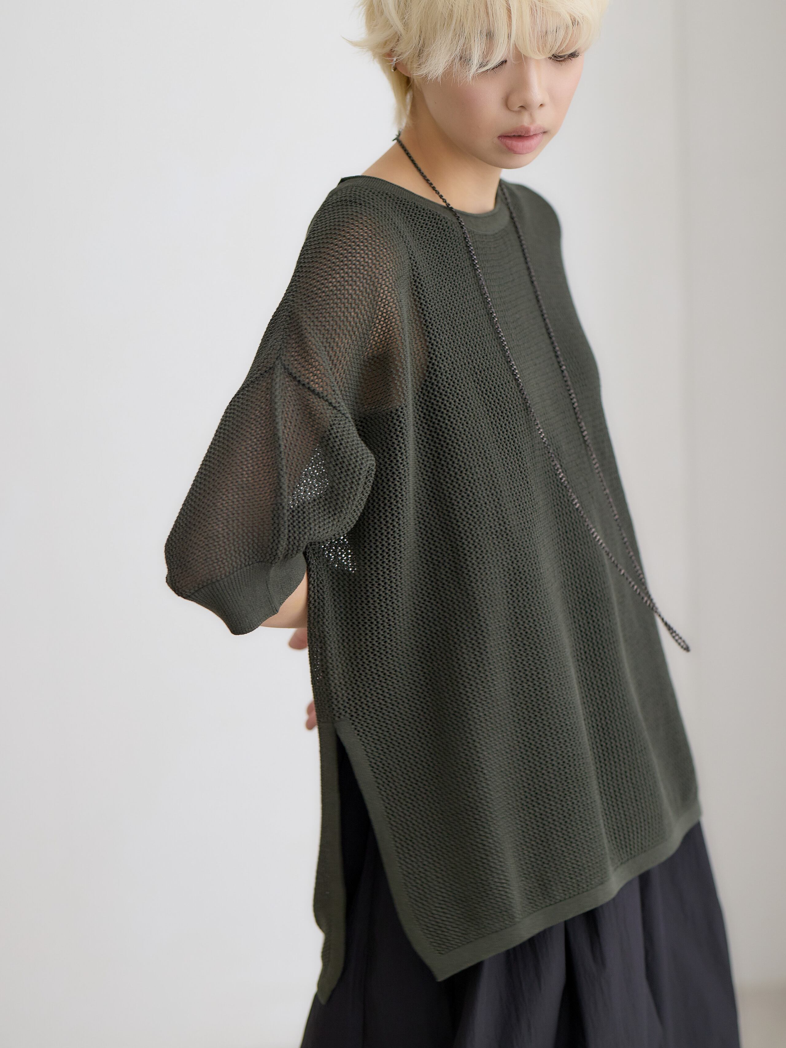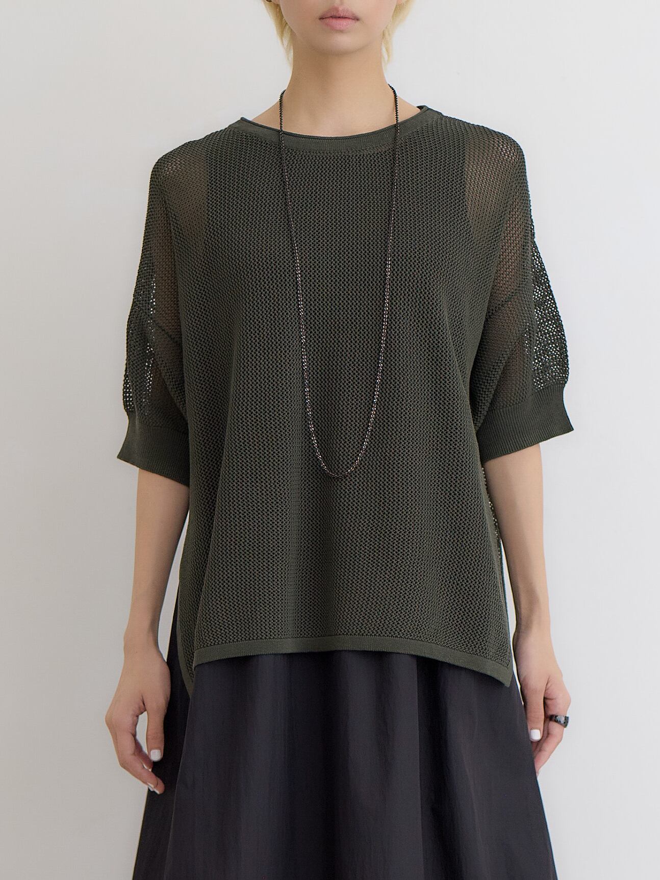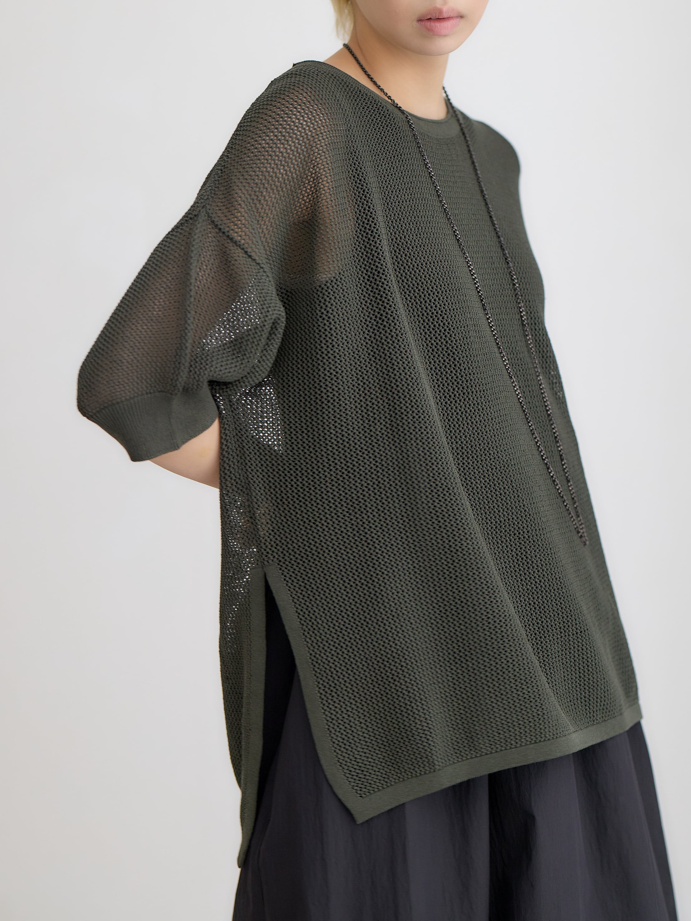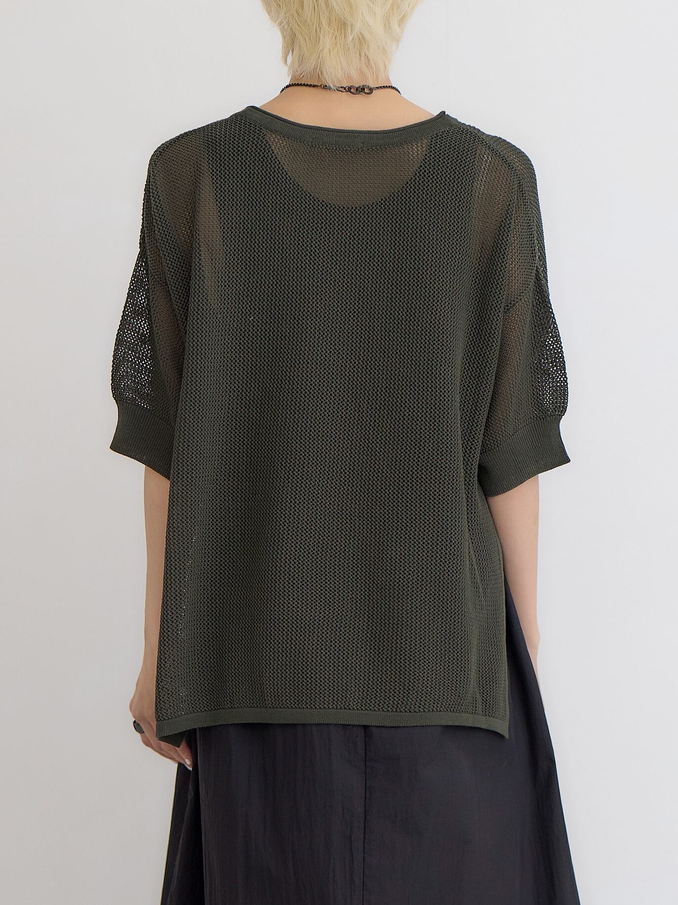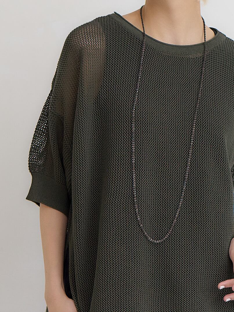 メッシュコットンゆったりニットプルオーバー / ダークグリーン