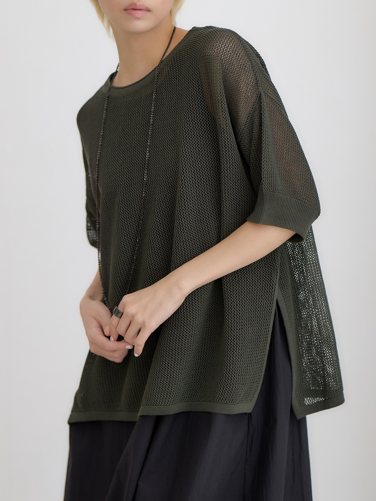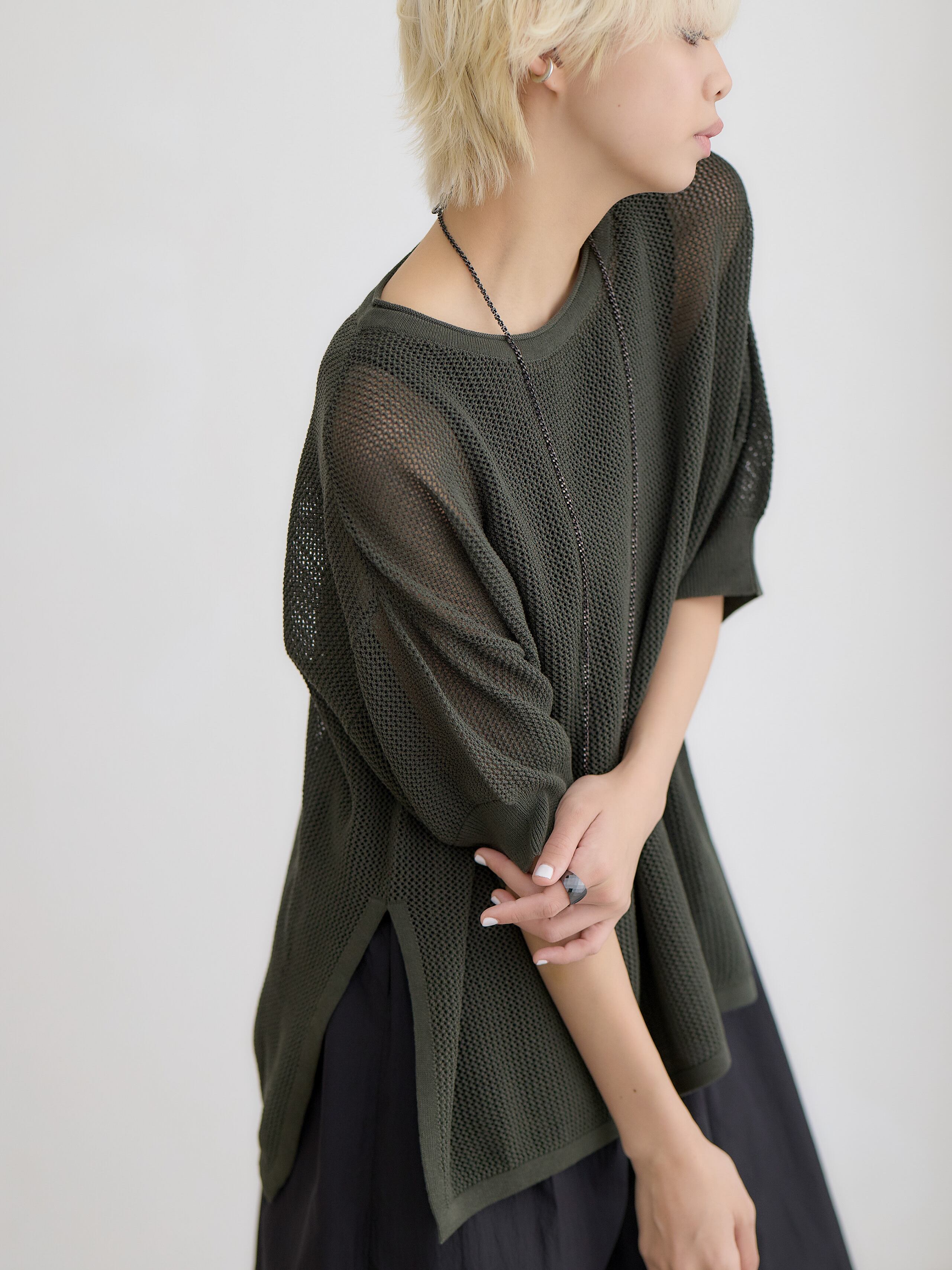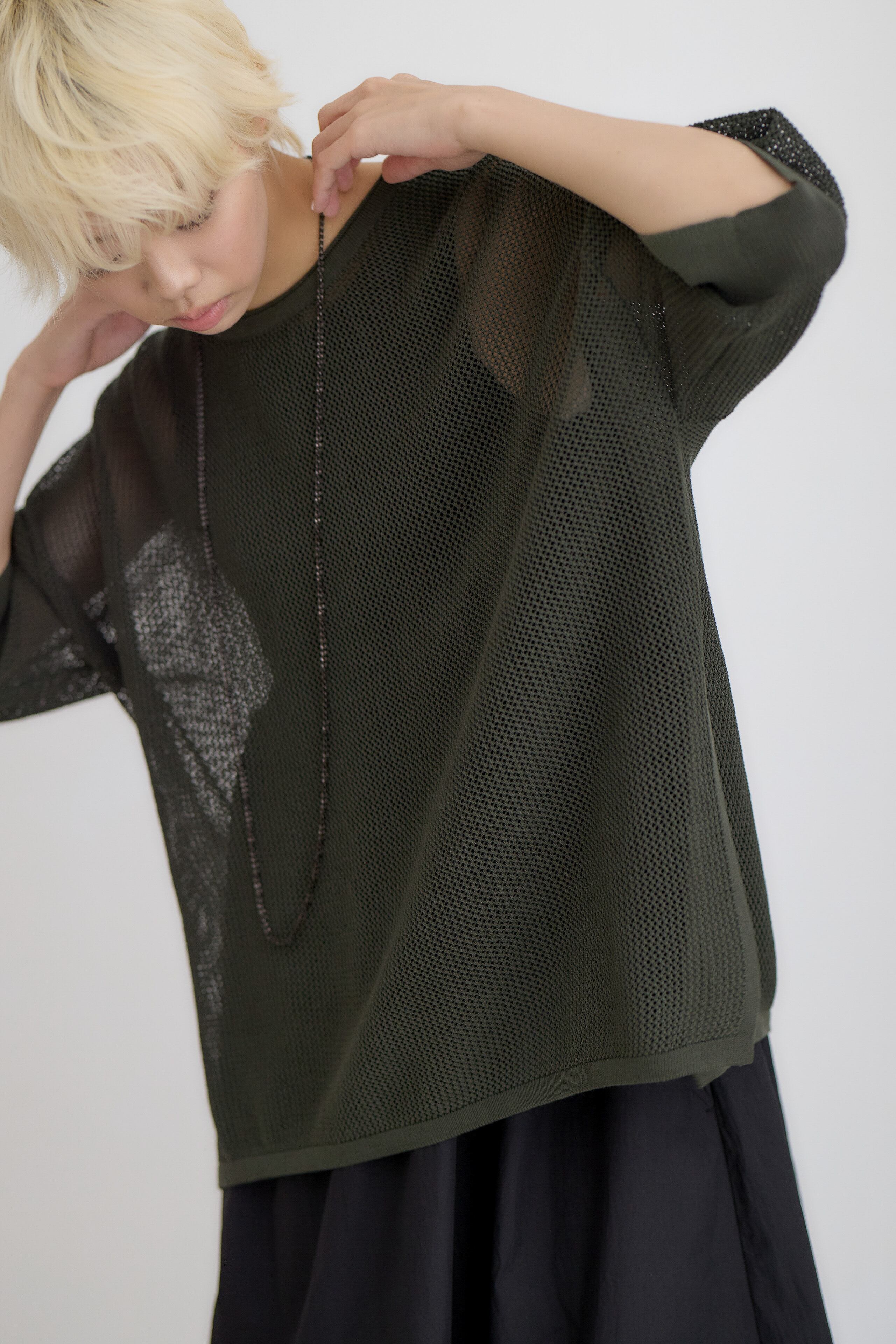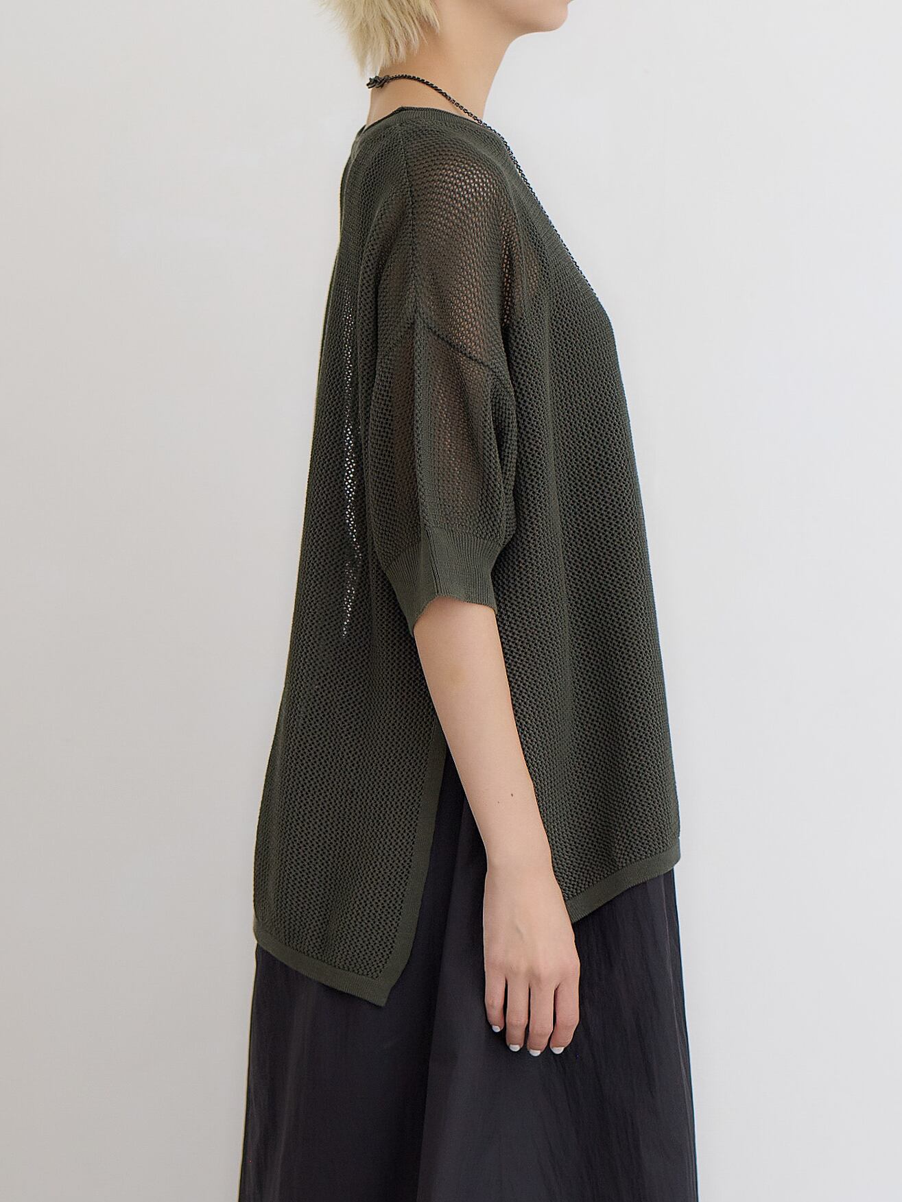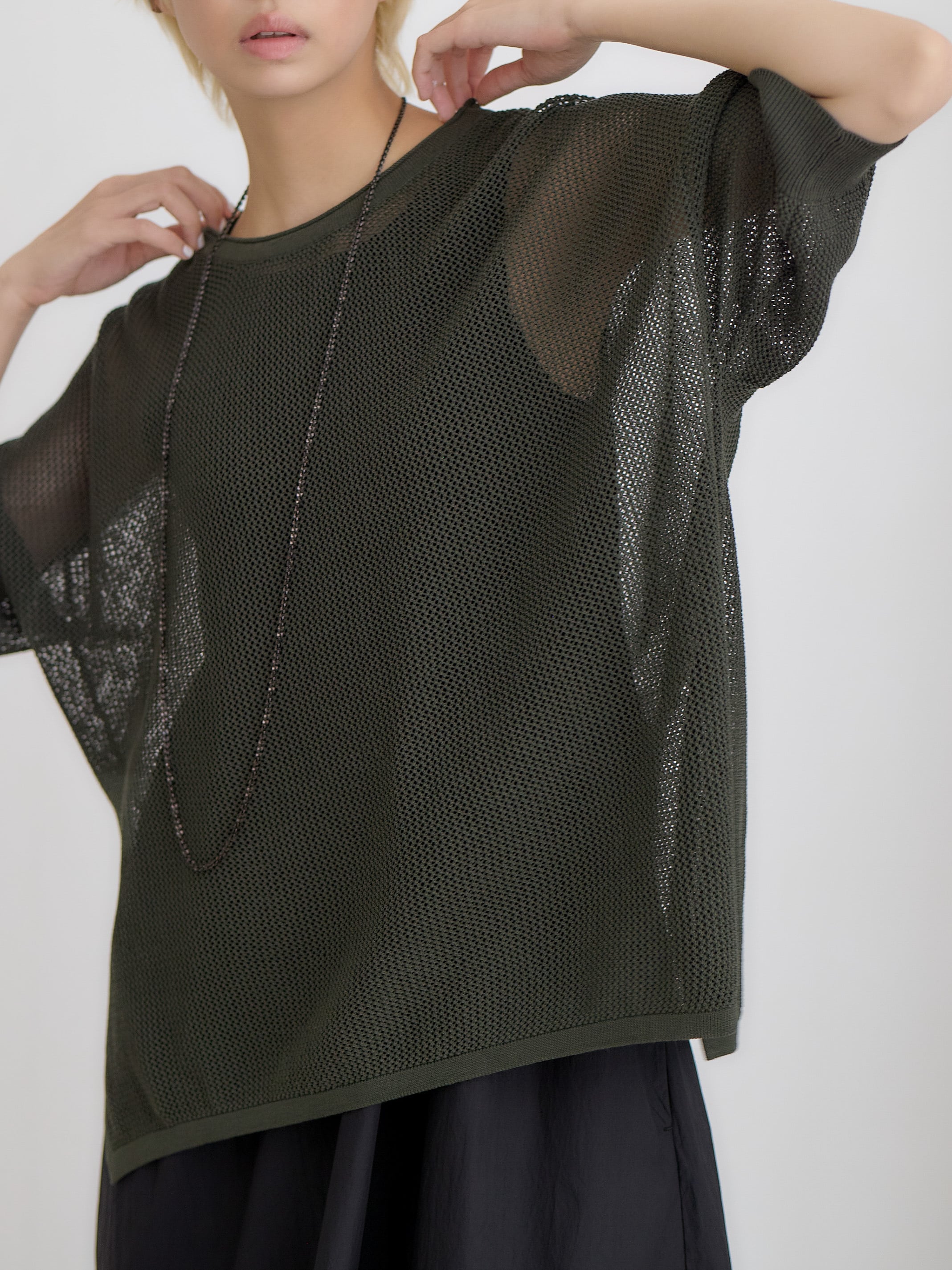 メッシュコットンゆったりニットプルオーバー / ダークグリーン