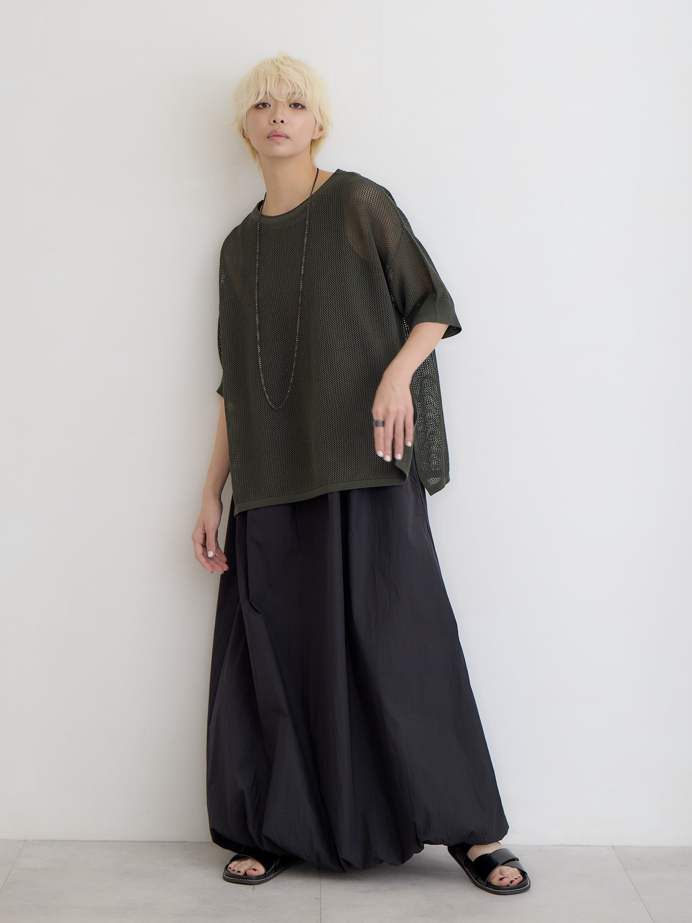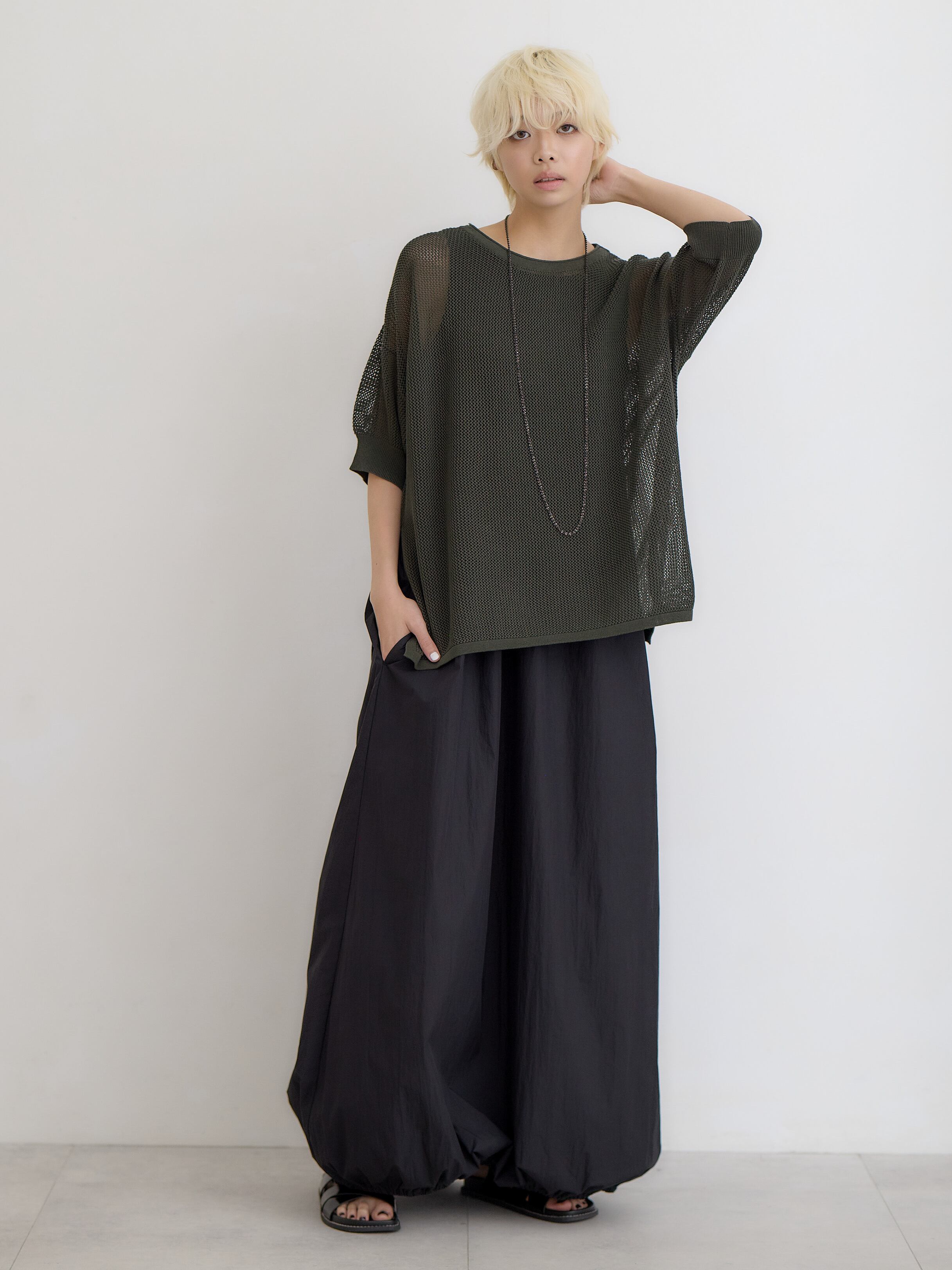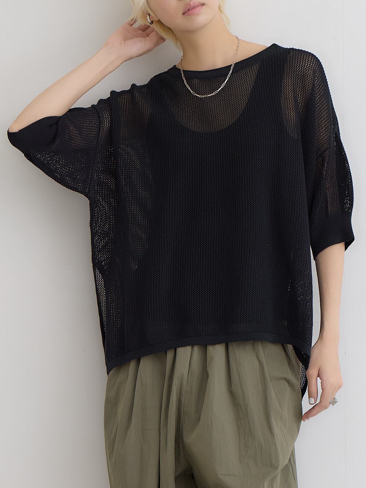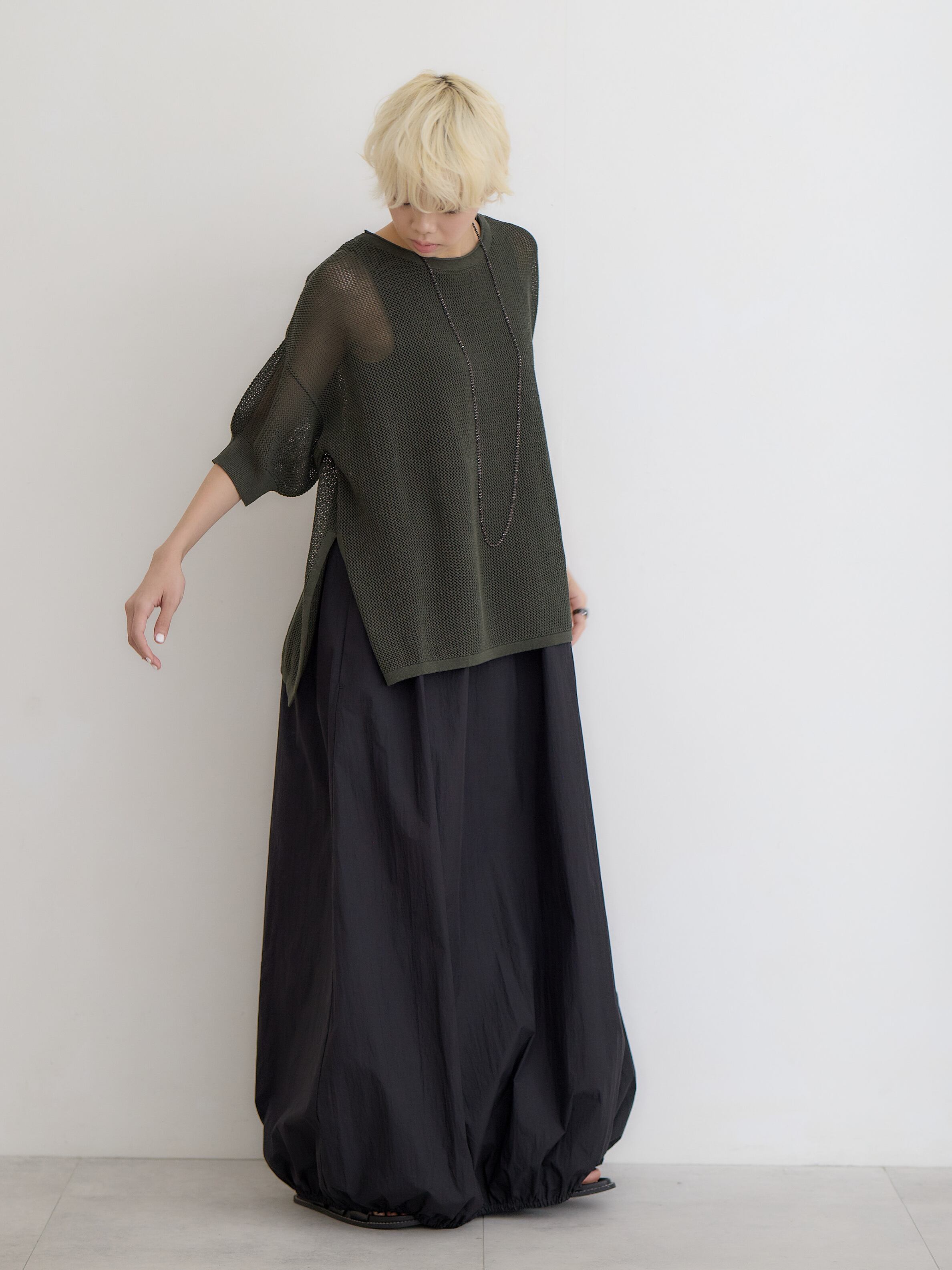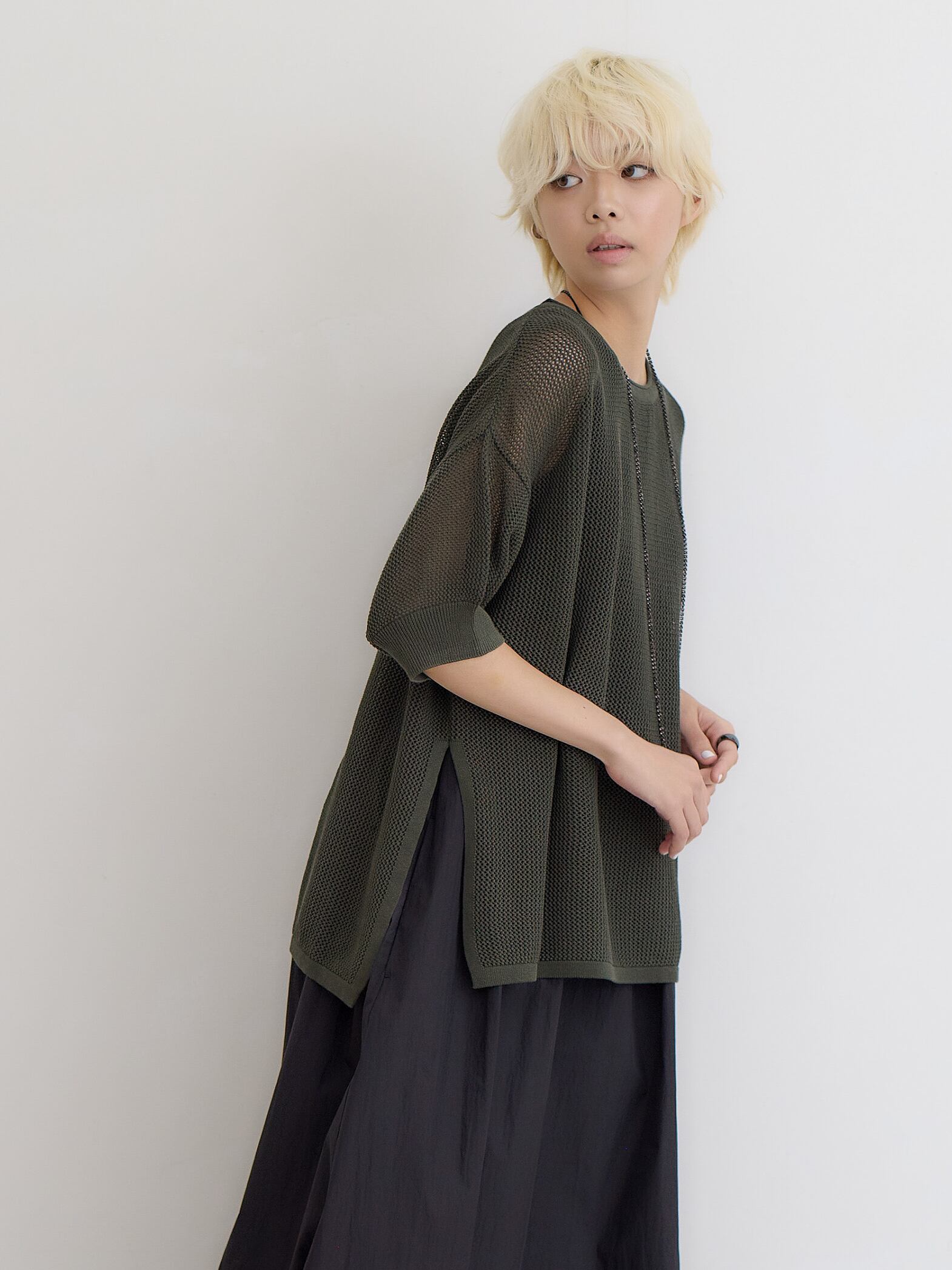 メッシュコットンゆったりニットプルオーバー / ダークグリーン